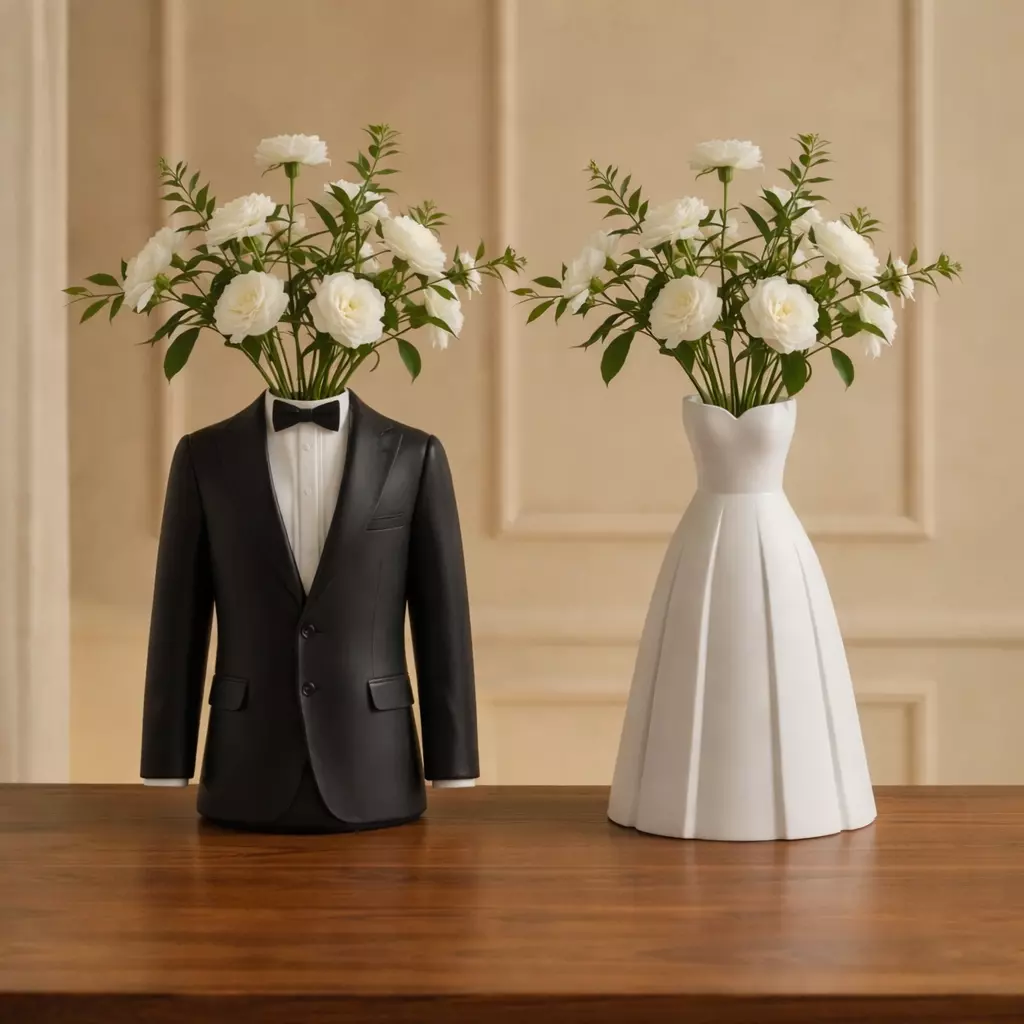 A stylish and elegant 3D printable vase set inspired by a bride and groom.This unique design features two decorative vases shaped like a wedding dress and a tuxedo suit, making it a perfect gift for weddings, engagements, anniversaries, or romantic home decor.