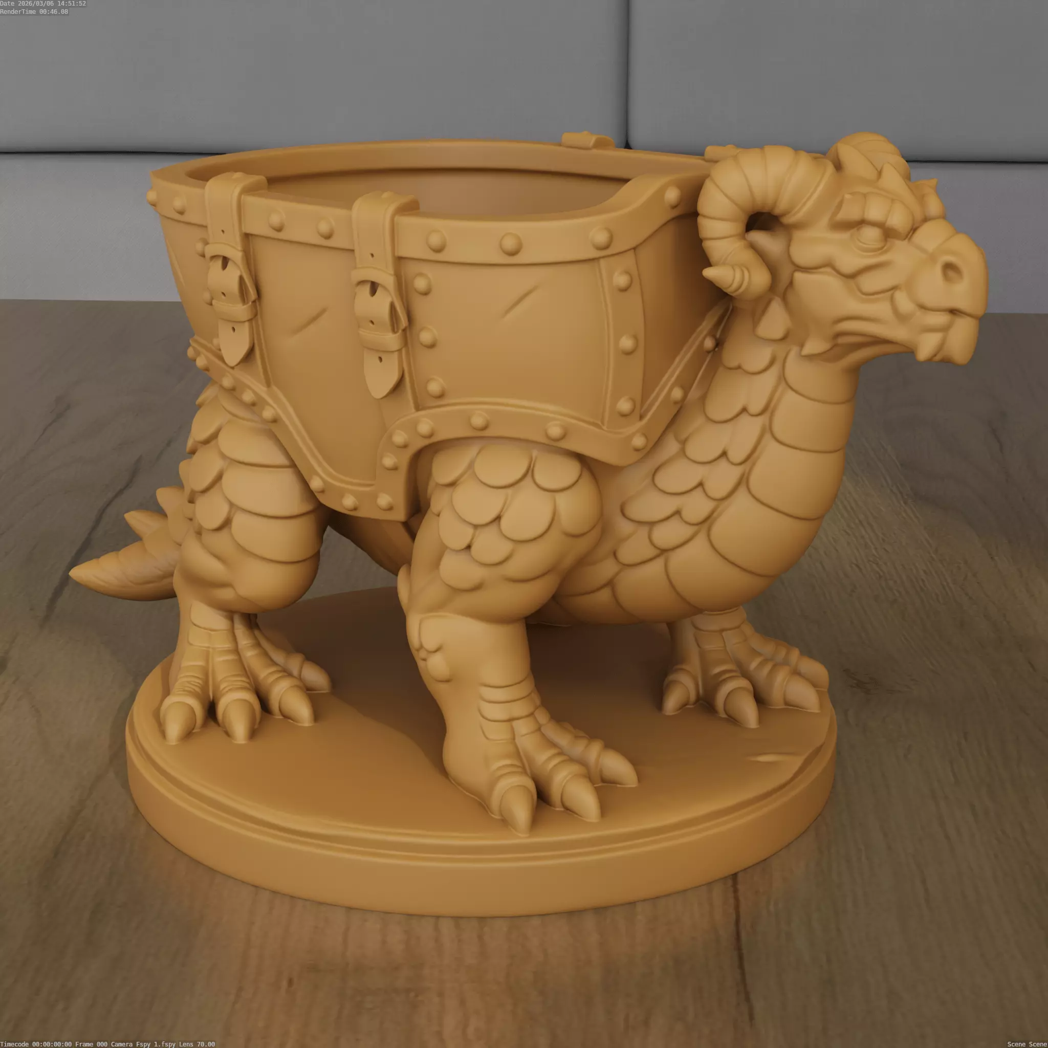 This 3D printable model features a cute fantasy creature carrying a large basket on its back. It works perfectly as a small flower pot for succulents or a desk organizer for your pens and pencils. The design includes detailed dragon scales and leather straps that look great when printed on any 3D printer.