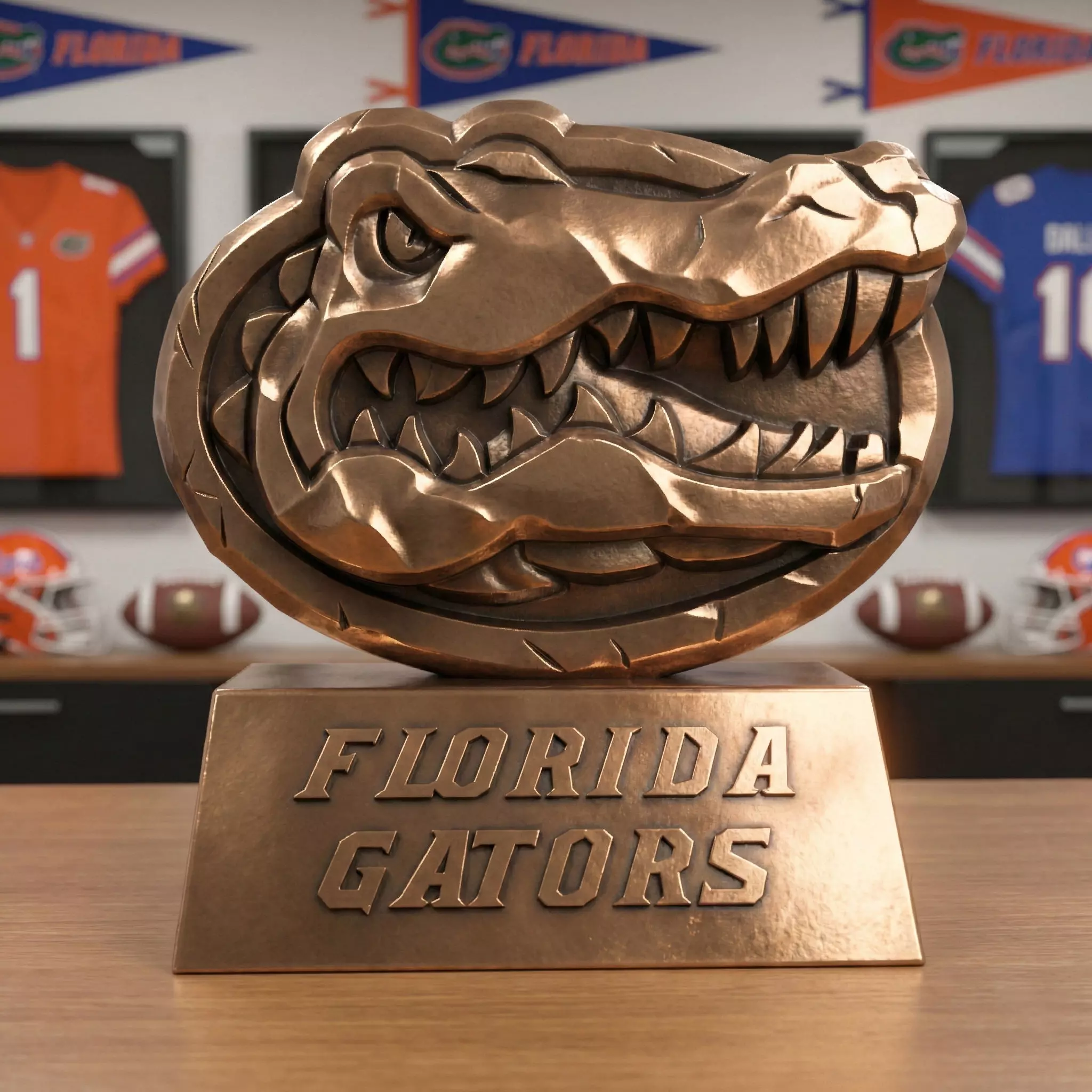 Show your Florida Gators team spirit with this high‑detail desk trophy relief based on the iconic NCAA football logo! This 3D printable sculpture turns the classic alligator head emblem into a bold relief mounted on a sturdy pedestal, perfect for your office, game room, dorm, or fan cave.