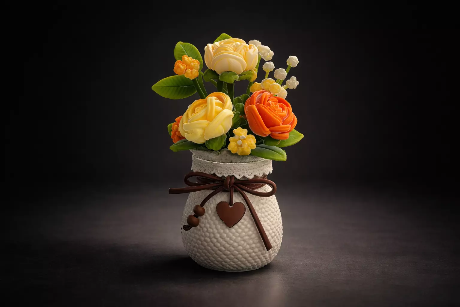 Crafted with precision using high-quality 3D printing, this piece features delicately sculpted flowers arranged in a charming textured vase with a ribbon and heart detail. The warm color palette brings joy and positivity, perfect for honoring mothers, wives, sisters, friends, teachers, or coworkers.