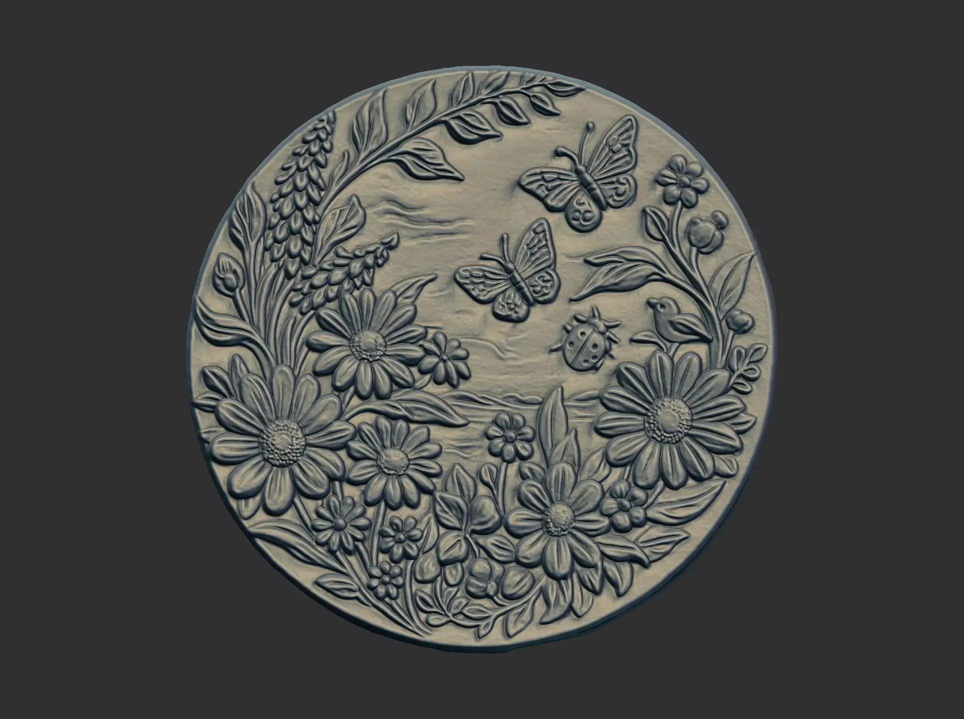 The image shows a detailed circular 3D relief carving depicting a vibrant nature scene.This carving features:A pair of butterflies gracefully flying amidst a profusion of flowers.A small bird perched amongst the blossoms.A ladybug, also nestled among the flowers, which are intricately detailed.Leafy branches that frame the scene along the top and left side.This imagery is commonly found in East Asian art, where butterflies can symbolize love, freedom, and the happy union of a couple, while flowers often represent beauty and sometimes femininity. The inclusion of a ladybug can be seen as a symbol of luck in various cultures. The combination of these elements likely creates a symbolic representation of a harmonious and joyful natural world or a celebration of love and beauty.The carving technique employed here is known as relief carving, where the design is raised from a flat surface, creating a three-dimensional effect without being fully detached like a sculpture in the round. This artwork could be crafted from various materials like stone, wood, metal, or clay, with the specific material influencing the texture, hardness, and detail possible.