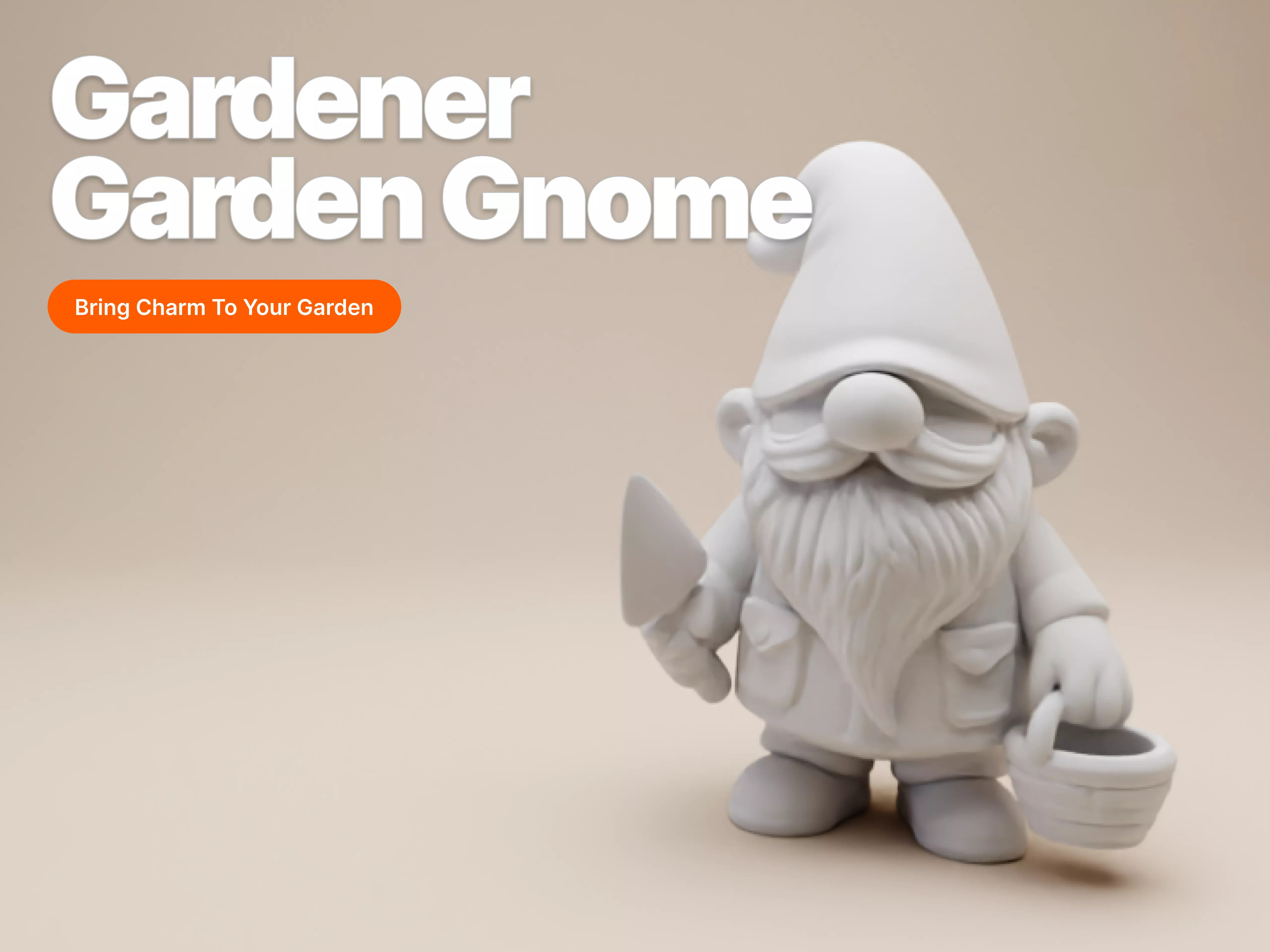 He holds a small shovel in one hand and a basket in the other, ready for a day of tending the garden. His body is short, rounded, and cartoonishly proportioned, with stubby arms and feet. The overall look is playful and minimalistic, as if sculpted from clay or resin.