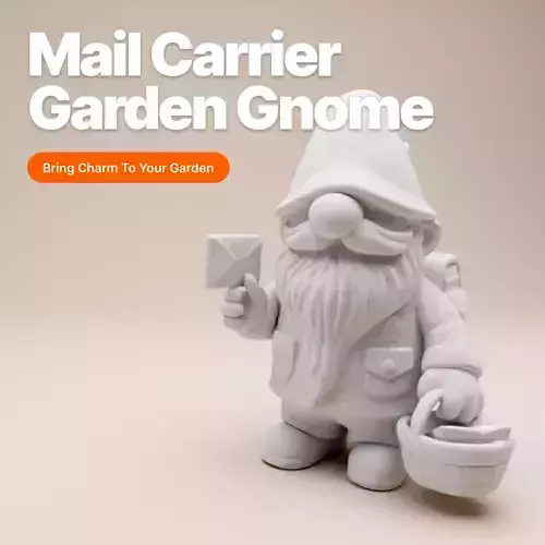 He holds a small shovel in one hand and a basket in the other, ready for a day of tending the garden. His body is short, rounded, and cartoonishly proportioned, with stubby arms and feet. The overall look is playful and minimalistic, as if sculpted from clay or resin.