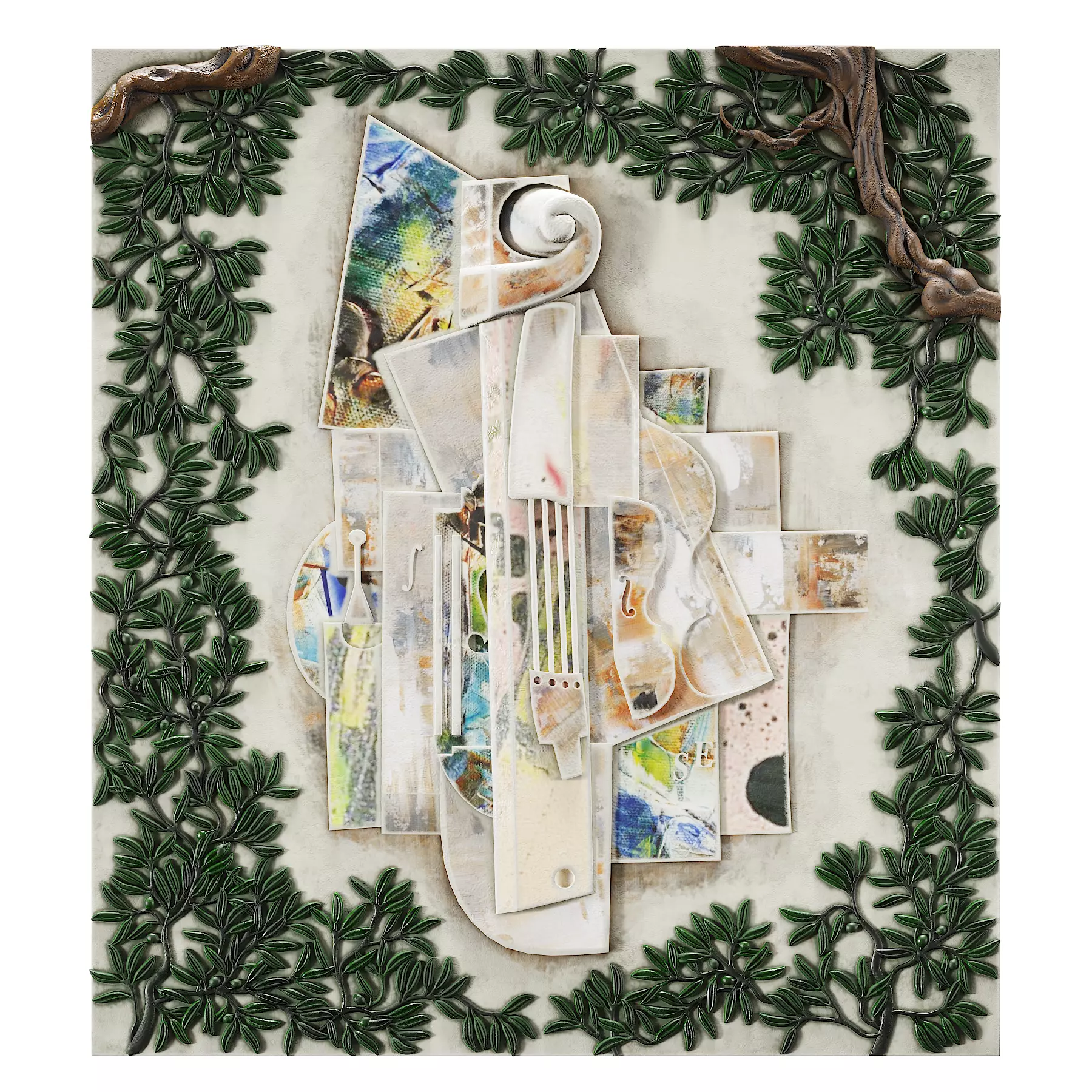 High-quality decorative relief wall panel combining bold geometric forms in the center with detailed olive tree branches on the sides.