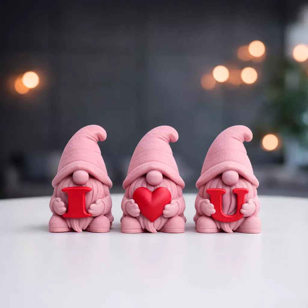 Each little gnome in this 3-piece STL collection holds a symbol of affection, “I”, “heart”, and “U” creating a heartwarming trio that radiates love wherever you place them. Perfect for 3D printing enthusiasts and romantic souls alike, these digital files let you craft your own charming Valentine display, desk ornament, or heartfelt gift. Designed with smooth, detailed textures that print beautifully on most home 3D printers, this set adds a playful yet elegant touch to any festive décor. Whether painted in classic Valentine red and white or customized with your favorite colors, these gnomes become a truly personal symbol of affection and joy.