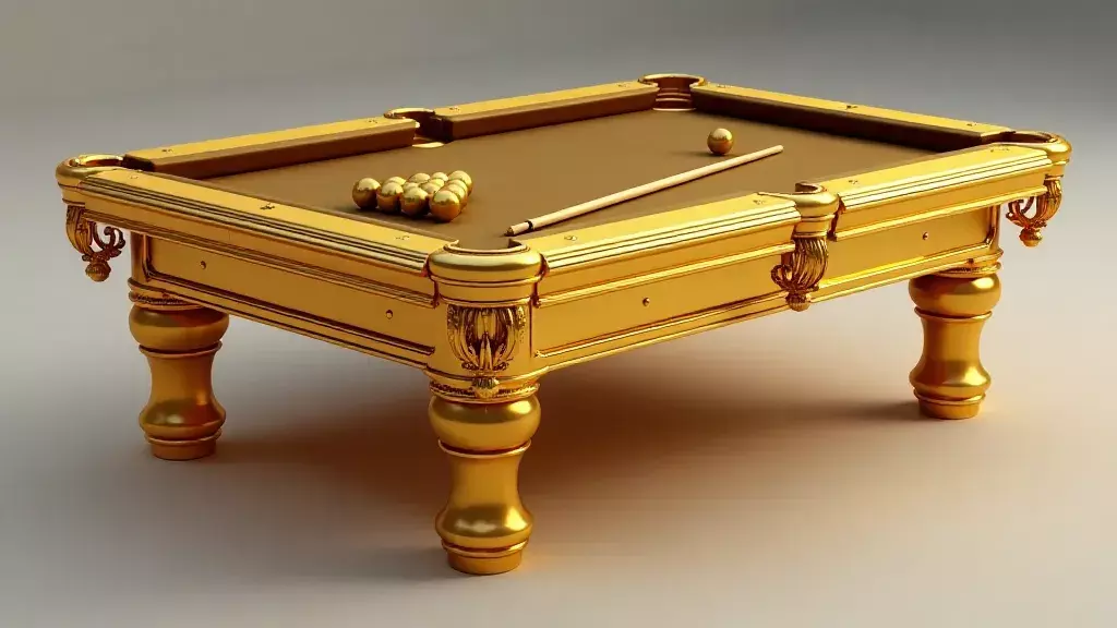 This 3D model represents a luxurious billiard table, with an elegant design and baroque decorative details, designed to look as if it were made entirely of solid gold.