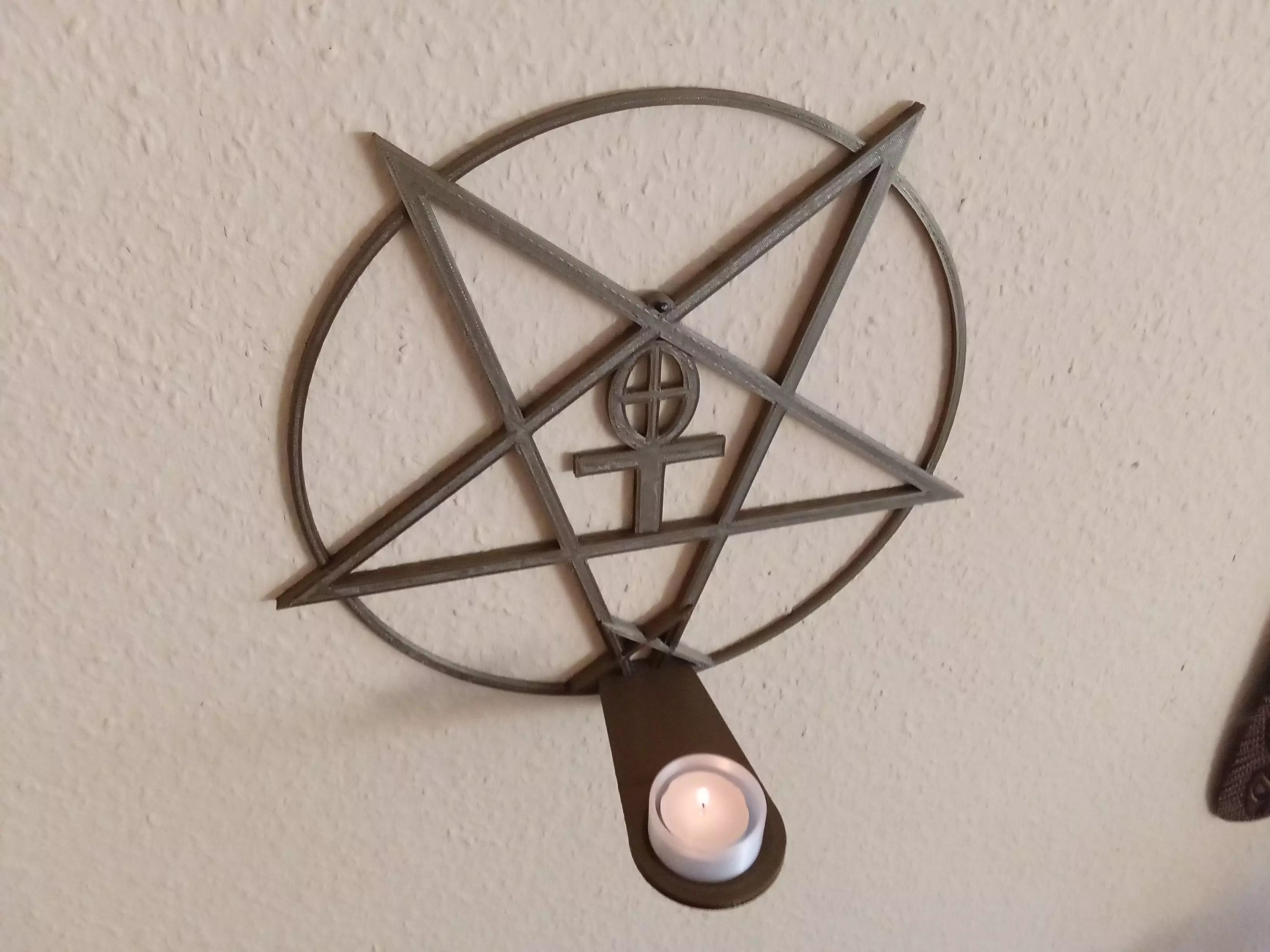 Pentagram for wall mounting as a candle holder or tealight holder. Very rustic and medieval style. Easy to print. Probably looks best in bronze or black matte.