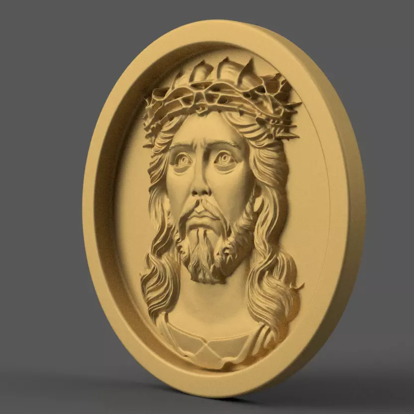 This 3D model features a crowned head of Jesus Christ in relief style. It is ideal for religious wall art or home decoration. The STL file is ready for printing and simple to use.
