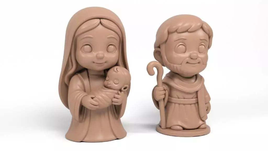 The Joseph, Mary, and Jesus cartoon figures are designed to capture the iconic Christmas scene in a lighthearted and cute style. The exaggerated features lend a whimsical feel, perfect for both children and adults to enjoy.