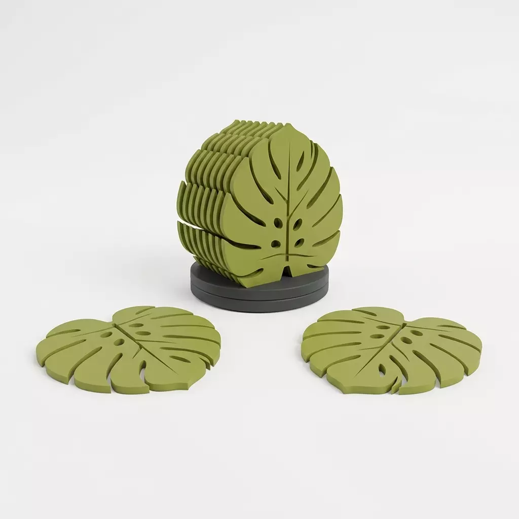 Unique leaf-shaped coaster designStackable set with matching holderSmooth, clean geometry and modern styleRealistic proportions and detailingPerfect for decor, rendering, and product showcases
