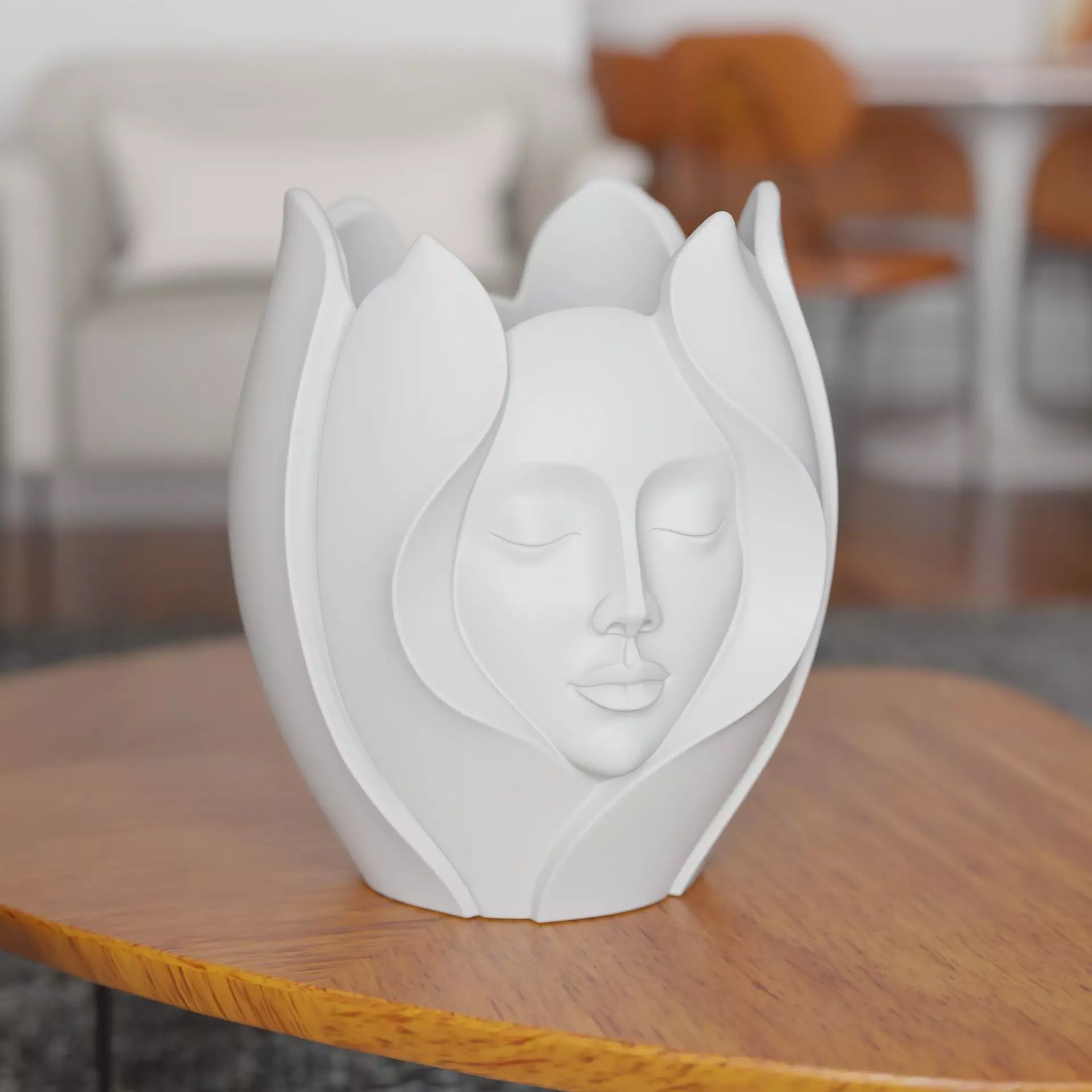 Lotus Face Vase – Artistic 3D Printable DecorThe Lotus Face Vase is a modern sculptural vase that blends a serene human face with soft lotus petals, symbolizing calmness, balance, and inner peace.This elegant design works beautifully as both a decorative art piece and a functional vase.Perfect for:• Home interior decoration• Living rooms, bedrooms, offices• Yoga, meditation, spa spaces• Artistic and minimalist gifts