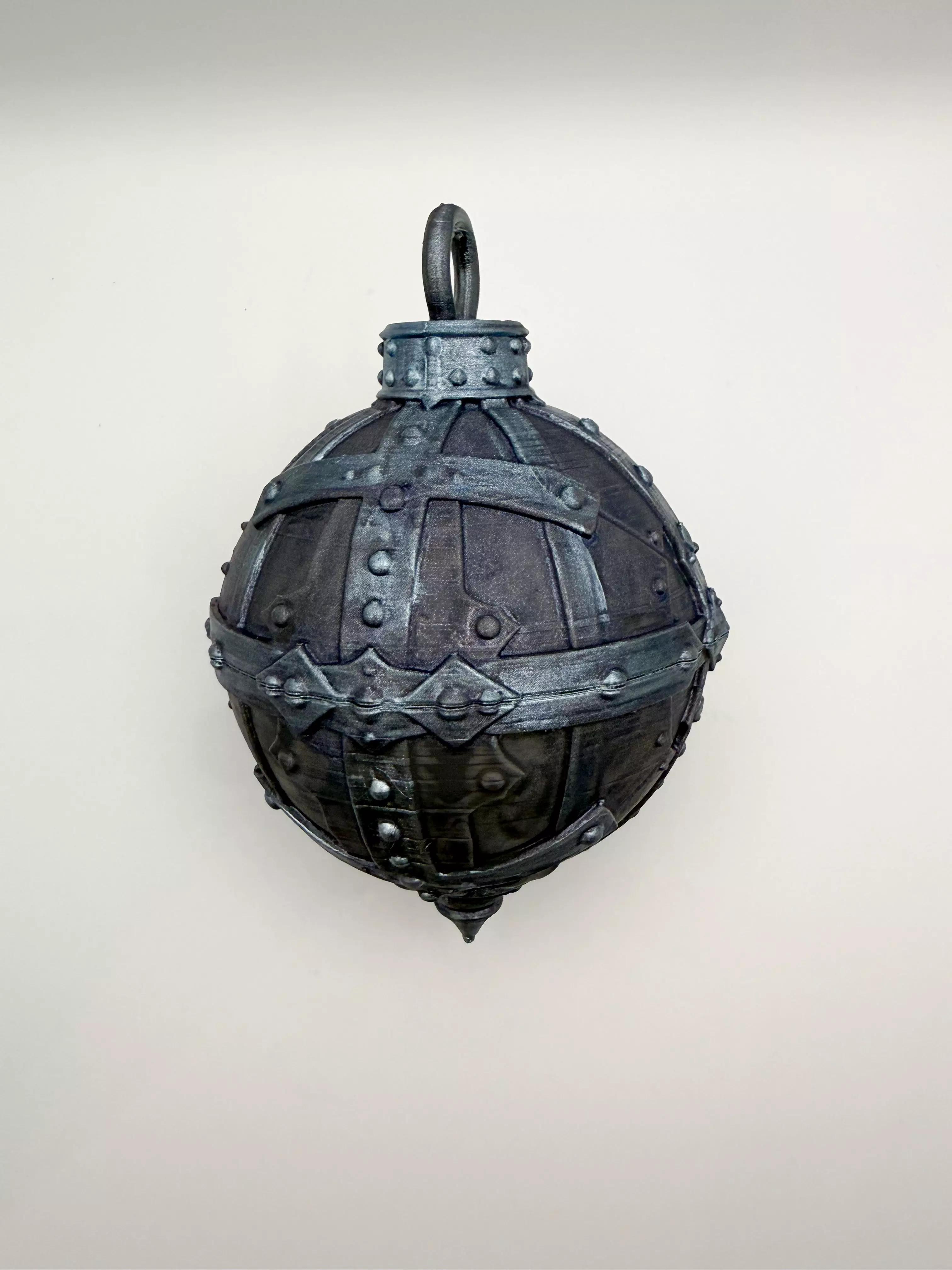 A heavy, armored Christmas bauble inspired by medieval blacksmithing and forged steel aesthetics.