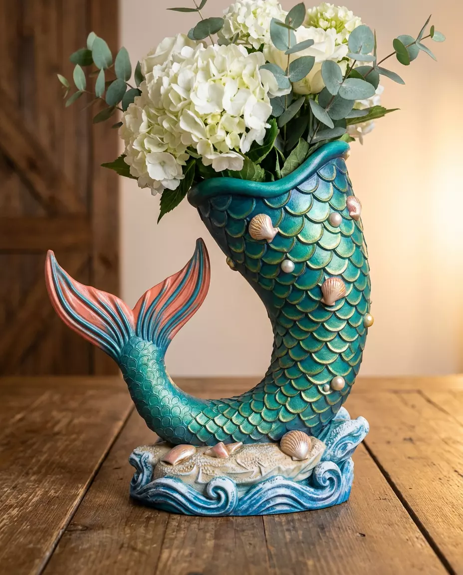 Bring the magic of the ocean to your home. This vase is sculpted in the shape of a graceful mermaid tail with detailed scales and a wave base. Perfect for aquatic plants or fresh flowers.