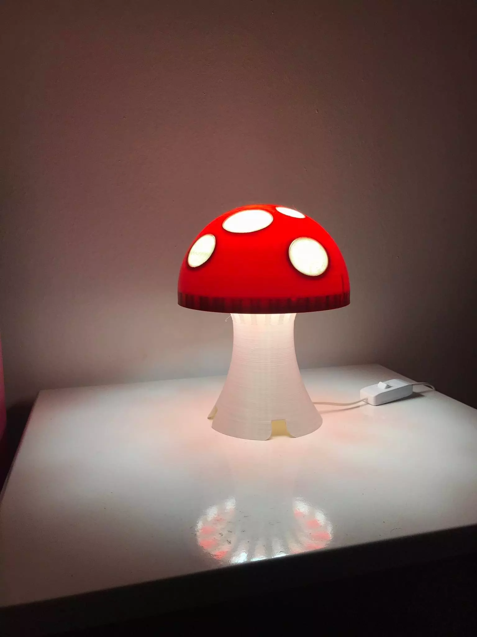 this 3D mushroom lamp is a very intuitive design kids like a lot very simple design with E27 light bulb and holdervery few parts only 3 prints neededfor the base :print as you like for the head no support neededtemperature and speed depends on your filament and printermake 4 processesfirst: 5% infill 0.2 layer height (until the height of the thread)second process : 0% infill 0.2 layer height until 75mm (so when the light is lit you don't see the infill lines)third process :0% infill / 0.1 layer height until 95 mmfourth process: 20%infill 0.1 layer height (so it's not weak in the top )for the white spots in the mushroomplace the all on the bed (cavity facing the bed)use raft and sequential printing with 0% infill and 0.1 layer height and 5% support