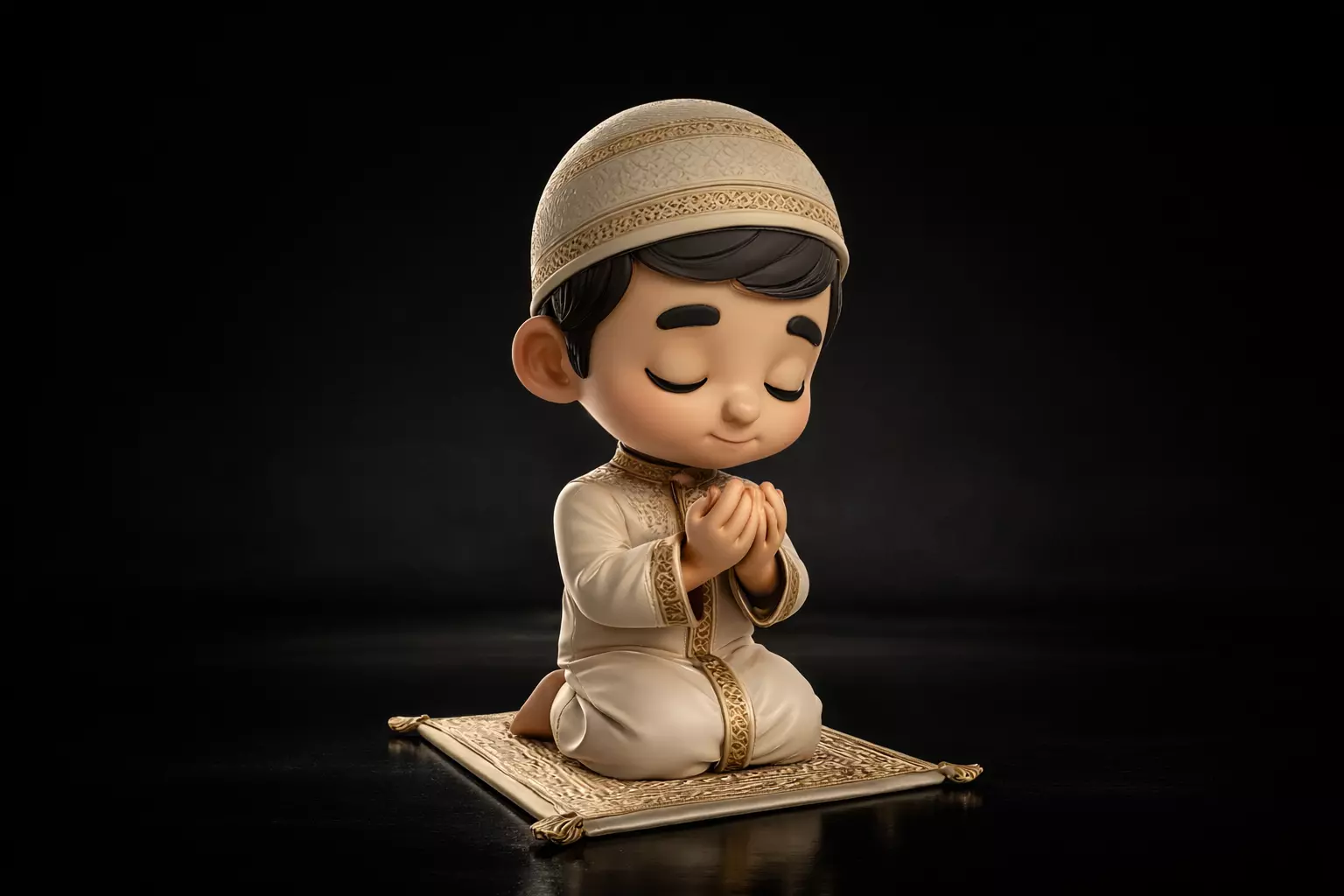 Bring a peaceful and heart-warming atmosphere to your home this Ramadan with this beautifully designed 3D printed Muslim boy praying figurine. This adorable character is shown kneeling on a prayer mat with hands raised in dua, wearing traditional Islamic clothing and a detailed prayer cap. The soft features and gentle expression make this piece perfect for creating a spiritual and calming environment during the holy month.
