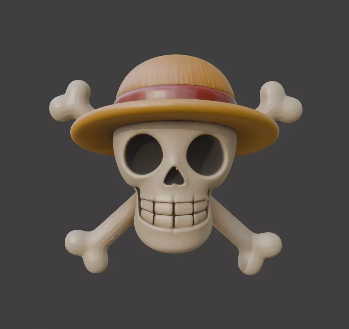 A stylized skull emblem inspired by the iconic Jolly Roger from One Piece. Featuring the classic grinning skull with crossbones and straw hat, this model is perfect for fans of the series looking to create custom props, wall art, or cosplay badges.