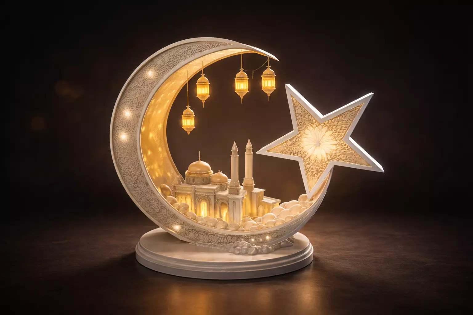 ramadan decoration , islamic art , crescent moon , mosque model , eid mubarak gift , muslim home decor , ramadan kareem , religious decoration , arabian nights , geometric star , hanging lantern , iftar table setting , spiritual ornament , decorative lamp , architectural model , holy month , islamic pattern , moon and star , elegant centerpiece , led light box