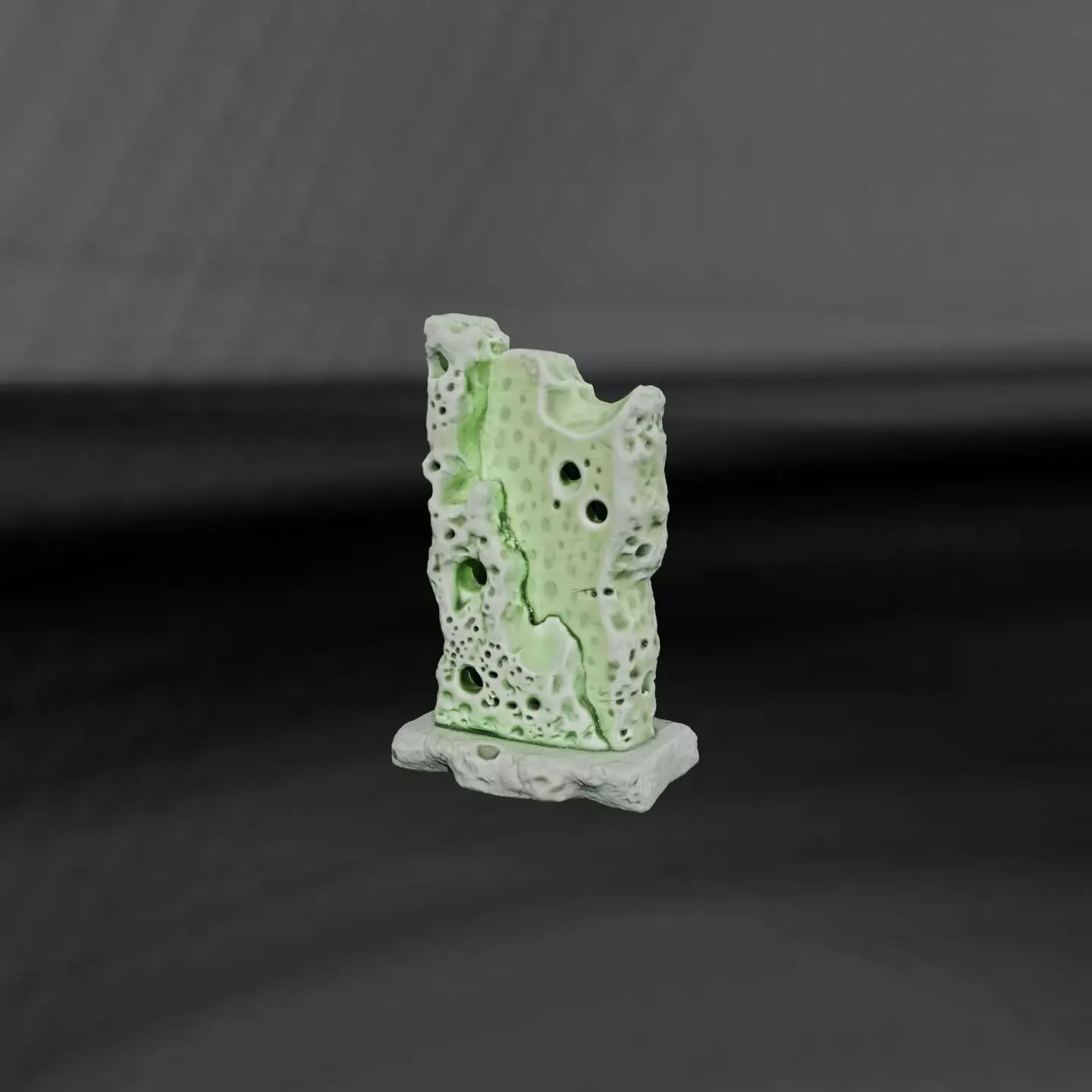 Catalog entry: Reefstone Bookend, Monolith variant. The rear face is kept flat for neat shelf alignment, paired with a weighted base that helps prevent slipping, while the front presents a coral-like surface that feels naturally formed rather than machined. Texture carries the narrative—randomized porous pits and uneven, shallow ridges with no repeating pattern—yet all details remain broad and printer-friendly, steering clear of sharp protrusions or fragile filigree. The body is solid and continuous, allowing it to function as a true bookend instead of a lightweight decorative prop, and the overall shape favors gentle angles that print cleanly with minimal support concerns. When turned, shifting light uncovers new shadows across each cavity and ridge. Engineered to print as a single watertight solid with thick walls, it adapts well to different materials and scales. It’s architectural-inspired decorative decor, not a precision mechanical component.