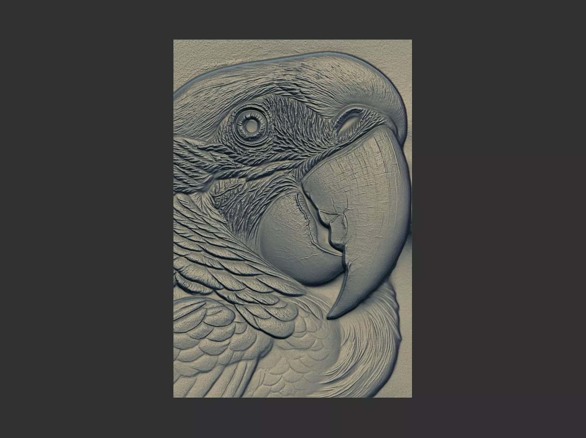 This image shows a detailed relief carving of a macaw's head. The carving is rendered in a monochromatic style, emphasizing the texture and contours of the bird's feathers, beak, and eye. The macaw's features are depicted with precision, highlighting the curved shape of the beak, the layered feathers around its neck, and the intricate details of its eye. The overall style of the image suggests a three-dimensional design, possibly intended for laser engraving or CNC machining. Macaws are known for their vibrant colors in real life, but this artwork focuses on the form and structure of the bird. They are large, long-tailed parrots found in the Americas, known for their intelligence and social behavior. Macaws are typically found in rainforests and are known for their strong beaks that they use to crack nuts and seeds.