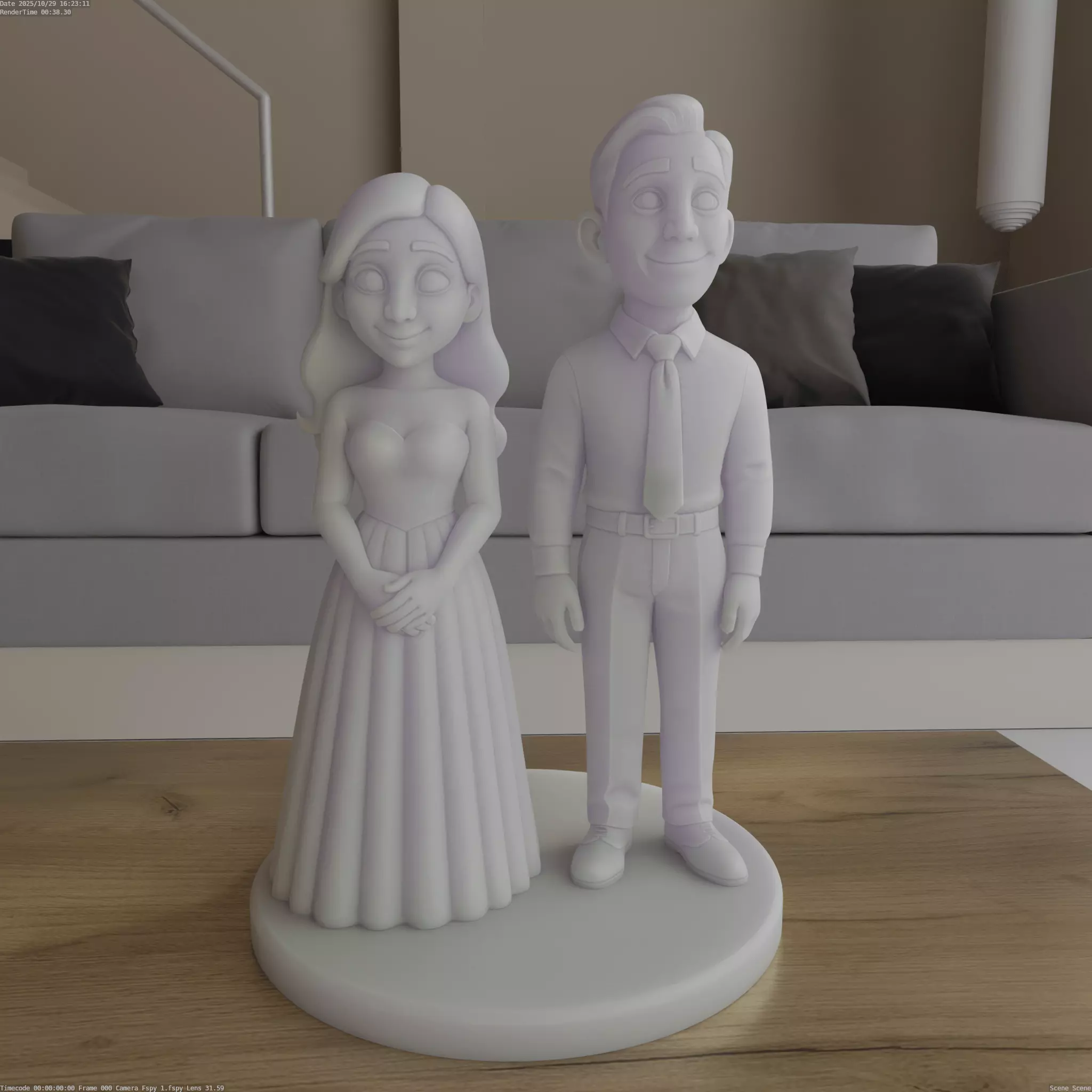 Design ConceptThis 3D model features a bride and groom in a playful artistic style, ideal for commemorating weddings or anniversaries. The figures are designed with exaggerated features that bring a whimsical touch to any collection.