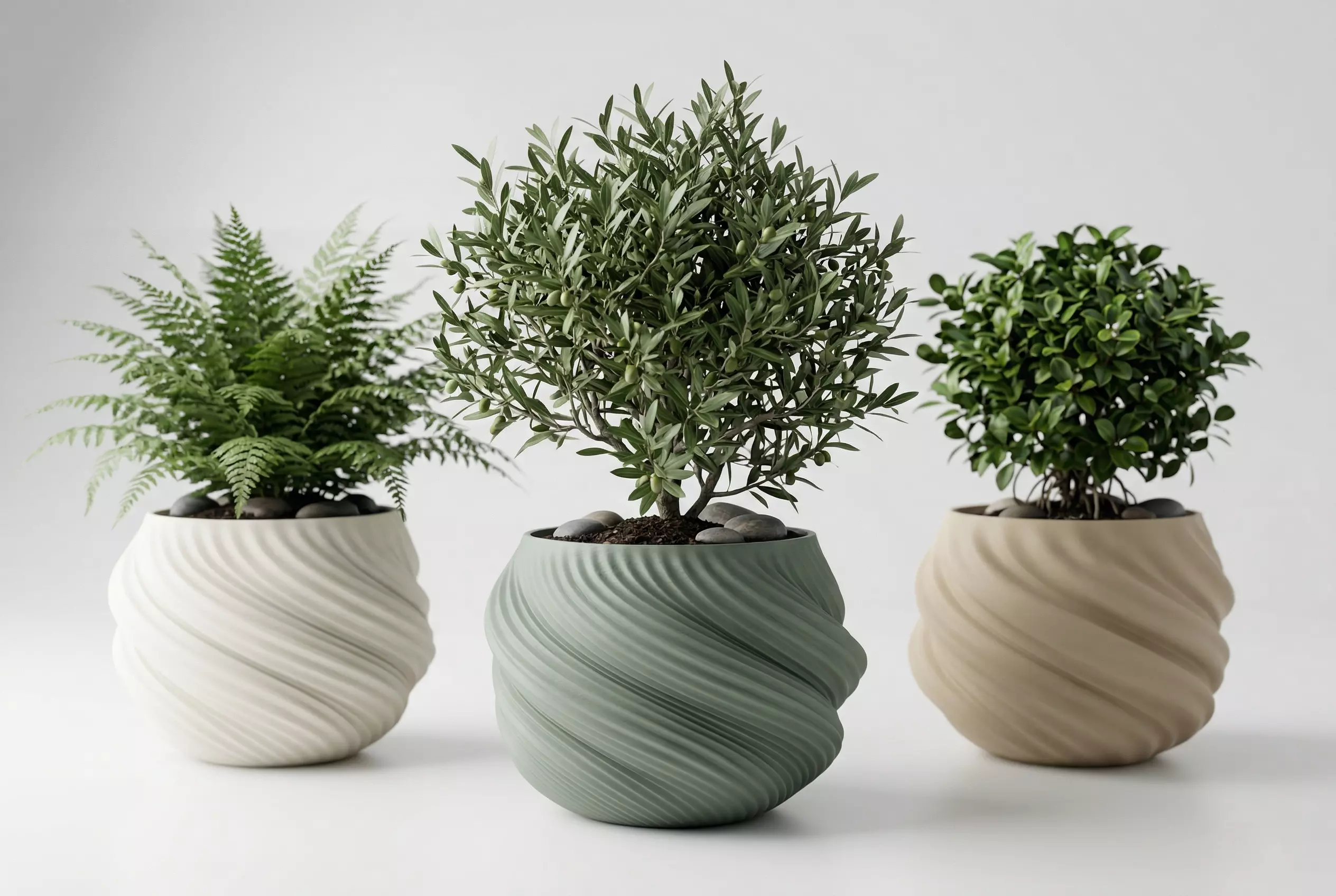 Each planter features a smooth flowing twist pattern combined with a solid wall thickness of approximately 1.2 mm, making them more durable and suitable for everyday use compared to thin vase mode prints.