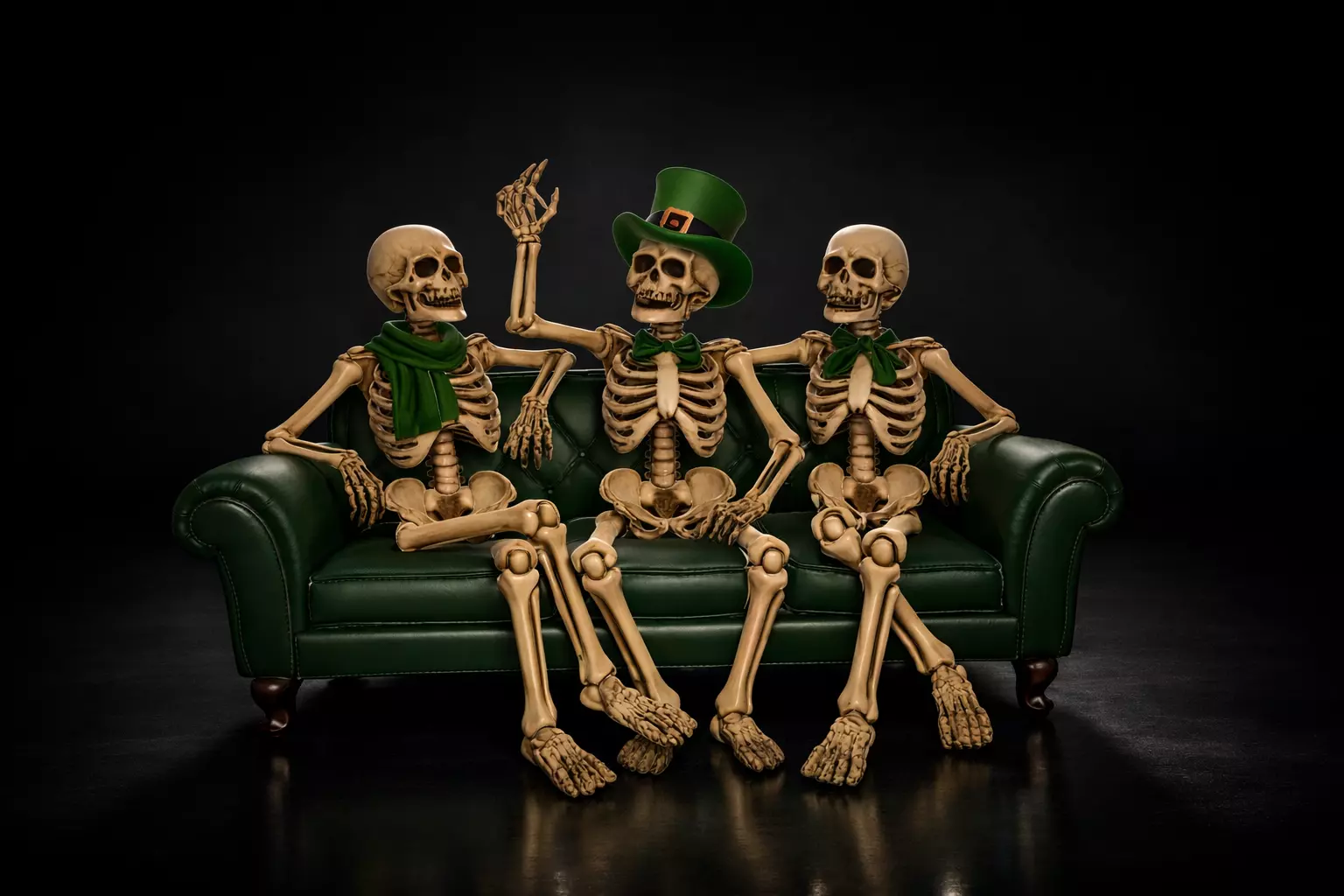 Celebrate the spirit of St Patrick’s Day with this fun and eye-catching Skeleton Trio lounging in style! Featuring three cheerful skeleton friends relaxing on a classic couch, dressed in festive green accessories including a lucky top hat and cozy scarves, this design brings humor and Irish charm to your seasonal decor. Perfect for adding personality to shelves, desks, mantels, or party displays, this playful piece is sure to spark smiles and conversations.Designed with clean details and balanced structure, this collectible makes a wonderful decoration for St Paddy’s celebrations, themed parties, or year-round quirky home decor. It’s a great gift for fans of skeleton art, holiday decorations, Irish culture, and unique collectibles. Whether displayed alone or as part of a festive setup, this lucky trio adds a touch of fun and charm wherever it sits.Ideal for decorators, hobbyists, and collectors looking for something different, this festive skeleton couch scene blends humor, seasonal spirit, and creative style into one memorable piece. Bring home a little luck, laughter, and Irish flair with this cheerful St Patrick’s Day decoration.