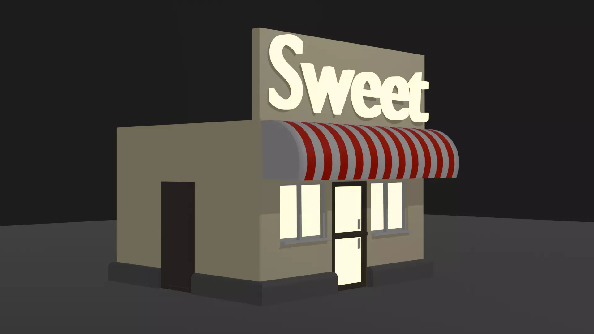 This is a simple, stylized 3D model of a small sweet shop. The building features a rectangular structure with beige walls and a dark brown base and trim. The front entrance has a black-framed glass door, flanked by two windows, giving the shop a welcoming appearance. Above the entrance, there is a large sign with the word Sweet in bold, illuminated white letters, making it easily noticeable.