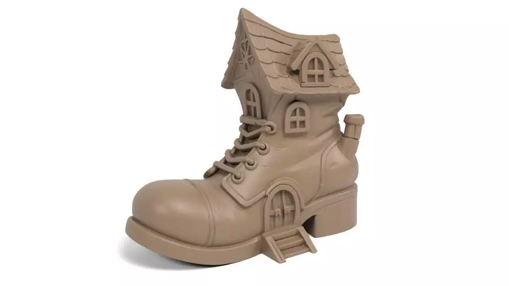 The design reflects a whimsical blend of fantasy and fairy-tale elements, seamlessly combining a boot and a tiny house. Its playful aesthetic is crafted to captivate imagination while evoking a sense of wonder.