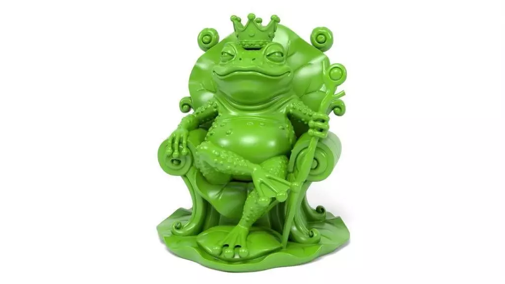 This model features a regal frog seated on a decorative throne, embodying a whimsical theme that combines artistic design with a fairytale essence.