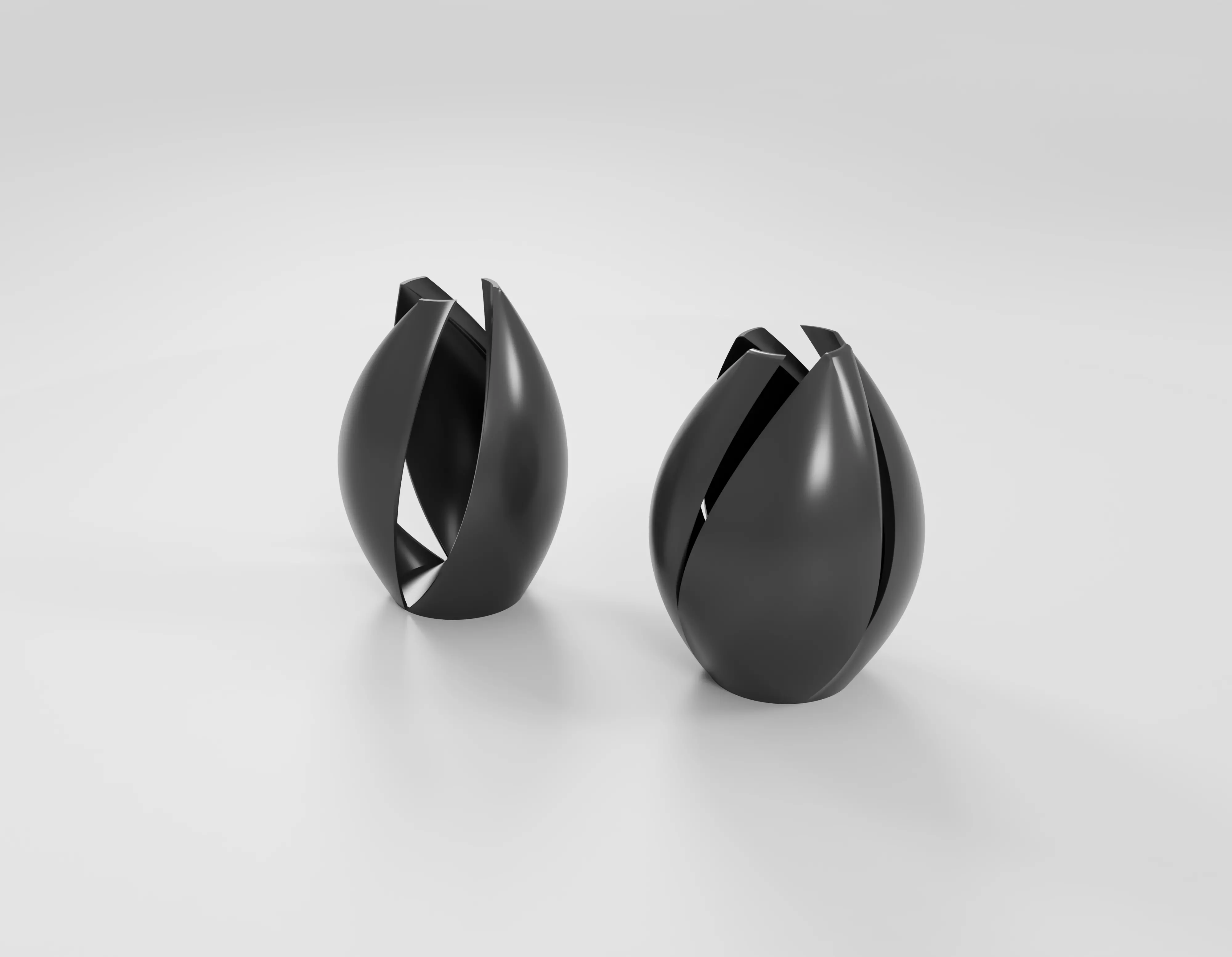 These are two sculptural vasses inspired by the fluid motion of nature and the delicate opening of a botanical bud. Designed with a focus on dynamic curvature, these models features three and four sweeping segments that spiral upward to create a unique, open-aperture rim. The overlapping petal design creates a sense of rotation and growth, making them look different from every angle.