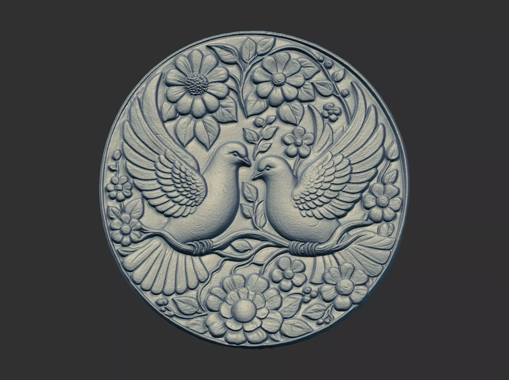 The image shows an embossed plaque featuring two doves on a branch surrounded by flowers. This type of design is often associated with themes of peace, love, and hope. Doves, particularly white doves, are widely recognized symbols of peace, love, and purity across various cultures and religions, including Judaism, Christianity, Islam, and Paganism. They are also commonly associated with concepts of freedom, new beginnings, and spiritual guidance. This specific art piece could be:A wall art or home decor item meant to symbolize peace and love within a space.Part of a larger collection of embossed or sculpted artworks featuring natural themes and symbolic elements.An example of 3D relief carving, where the background is carved away to create a raised image.Potentially, a model for a CNC (Computer Numerical Control) machine or a 3D printer, used to create physical carvings or prints from digital designs. CNC machines are frequently used for creating reliefs from various materials like wood.Reflecting a contemporary trend of using dove symbolism in art to advocate for environmental harmony and peace with nature. The material used in the piece is not specified, but embossed art can be created using materials like paper, leather, fabric, wood, and metal. If it's a wood carving, techniques like relief carving and undercutting would likely be used to achieve the 3D effect.