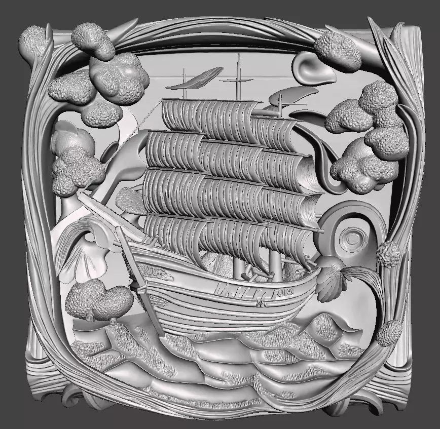 Highly detailed 3D relief featuring a classic sailing ship with full sails, enclosed in an elegant ornamental frame with flowing, organic and wave-inspired elements. The design is created in a decorative bas-relief style, making it ideal for 3D printing.