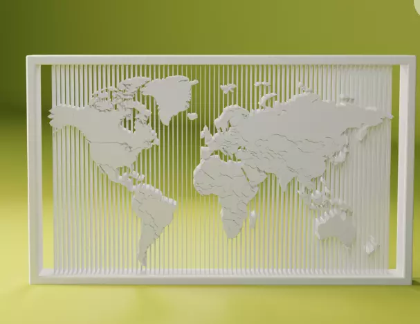 Experience the world in a whole new dimension with this stunning 3D representation of the world map. This meticulously crafted piece of art captures the continents in intricate detail, casting delicate shadows that dance gracefully against the backdrop of parallel lines. Set against a vibrant lime green background, this piece emanates a serene yet energetic aura. Encased in a sleek white frame, this 3D world map is more than just a geographical representation - it’s a fusion of art and science, a testament to the beauty of our planet. It’s a conversation starter, a statement piece, and a constant reminder of the vast and diverse world that awaits your exploration.