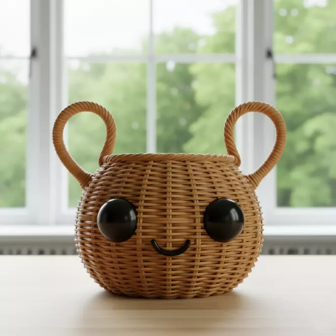 Design ConceptThe woven basket design blends traditional weaving techniques with a playful, modern twist. The oversized eyes and smile add a touch of whimsy, making it a delightful addition to any room while retaining the rustic charm of natural materials.