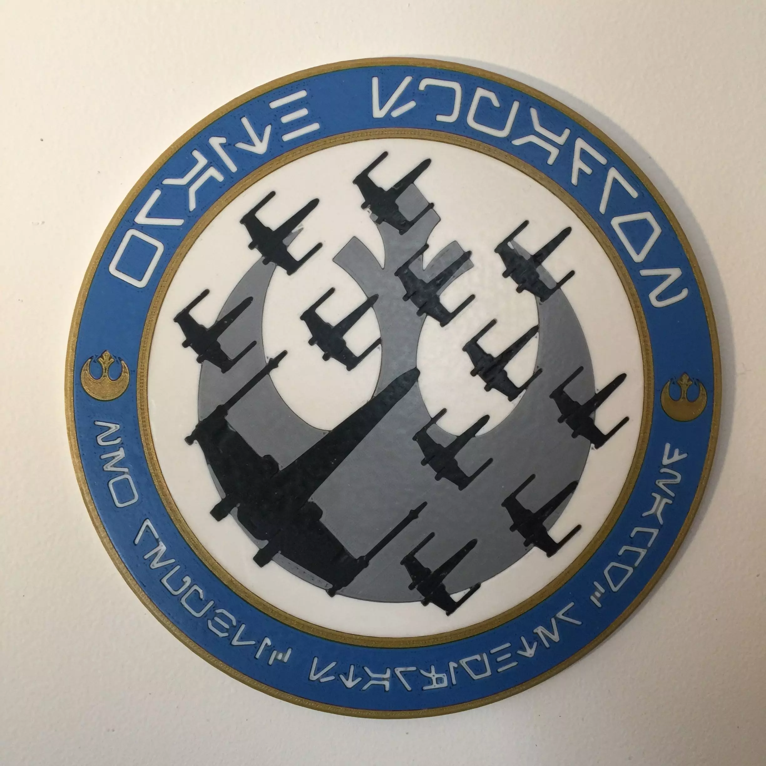 This plaque is based on the Wraith Squadron unit patch originally designed by Tyria Sarkin, the unit's scout and resident Jedi. I'll warn you straight off: in my case basically because it takes about a week to make. First I 3D print all the separate colours and assemble them into the basic unit (that takes about three days in itself). I then coat it in a thin layer of photopolymer resin which seeps into all the gaps and fills them, and then I leave it in the sun, or in my special UV curing box I'm making, until the resin is set solid. That again, for safety's sake, takes about a day. Then I have to hand-sand it down until it's smooth, then polish it with a series of increasing grades of sandpaper until it's REALLY smooth. Finally a generous coat of Armorall brings out the colours and protects it. Then it's ready for hanging!
