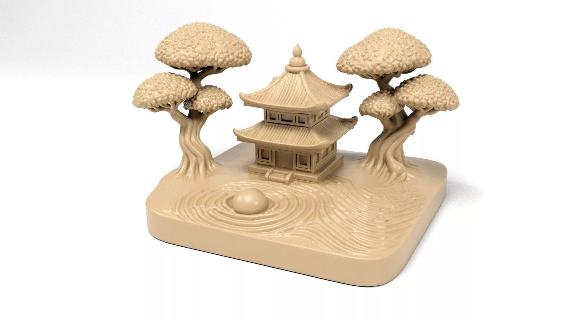 The Zen Landscape Sculpture represents tranquility and peace, featuring a serene scene of a traditional pagoda surrounded by exquisitely shaped trees and flowing patterns that evoke water.
