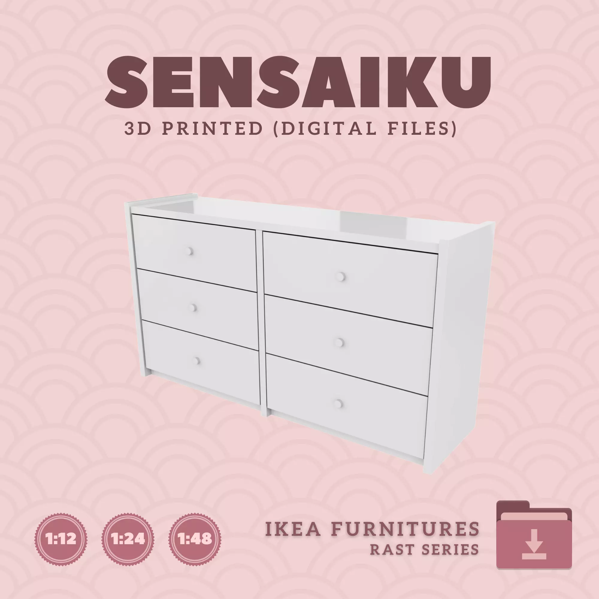 Name: 02. RAST 6 Drawer DresserManufacturer - IKEARecommended Printer: Resin 3d PrinterSeries: Furniture Designers SeriesScale: 1:12, 1:24 & 1:483D Builder: Sensaiku