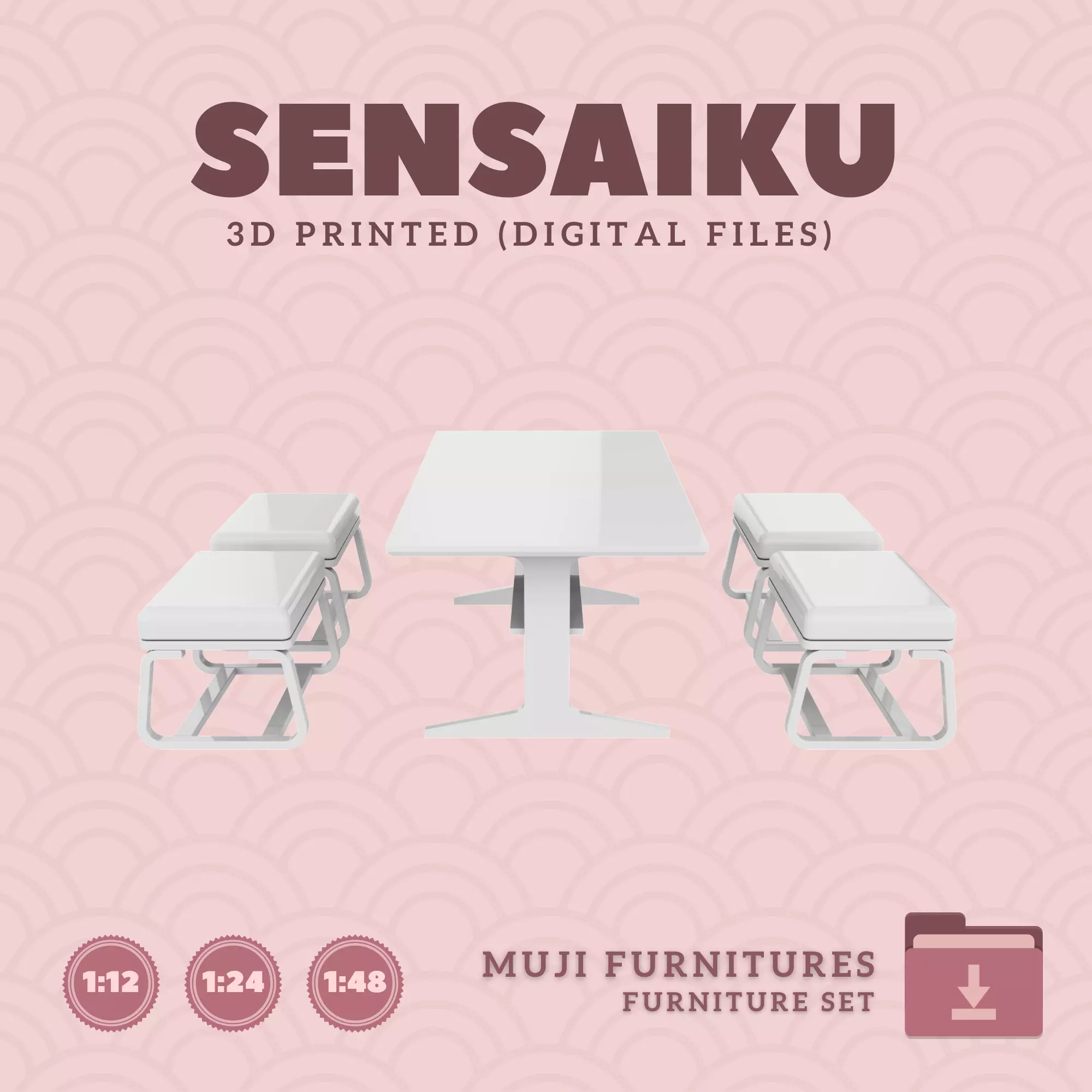 Name: 07. Muji Dining Table 60 In and Chair Set V7Manufacturer - MUJIRecommended Printer: Resin 3d PrinterSeries: Furniture Designers SeriesScale: 1:12, 1:24 & 1:483D Builder: Sensaiku