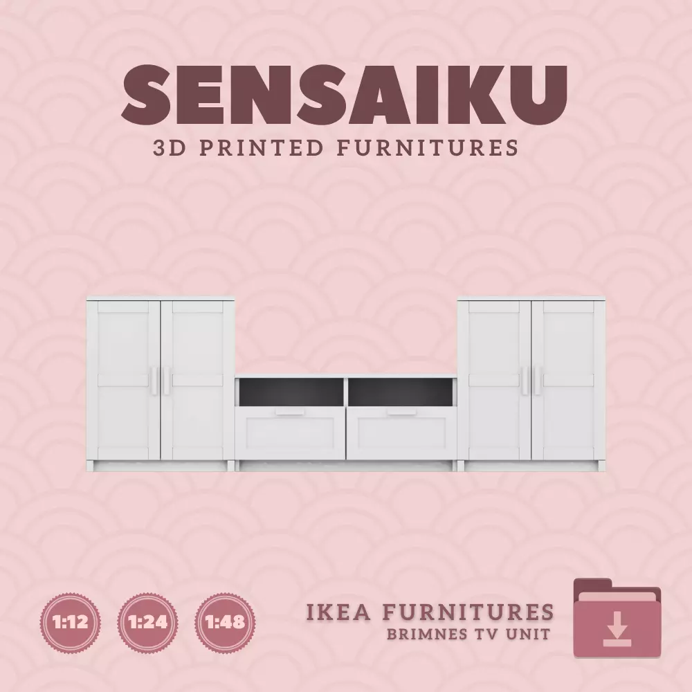 The BRIMNES TV Unit from IKEA is now available as a meticulously crafted miniature 3D model designed for 3D printing. Exclusively offered by Sensaiku, this 3D Print File perfectly captures the functionality and elegance of the original piece, scaled to 1:12, 1:24, and 1:48 sizes. It's the ideal addition to Dollhouse Miniatures, Modern Dollhouse Furniture, or diorama projects.