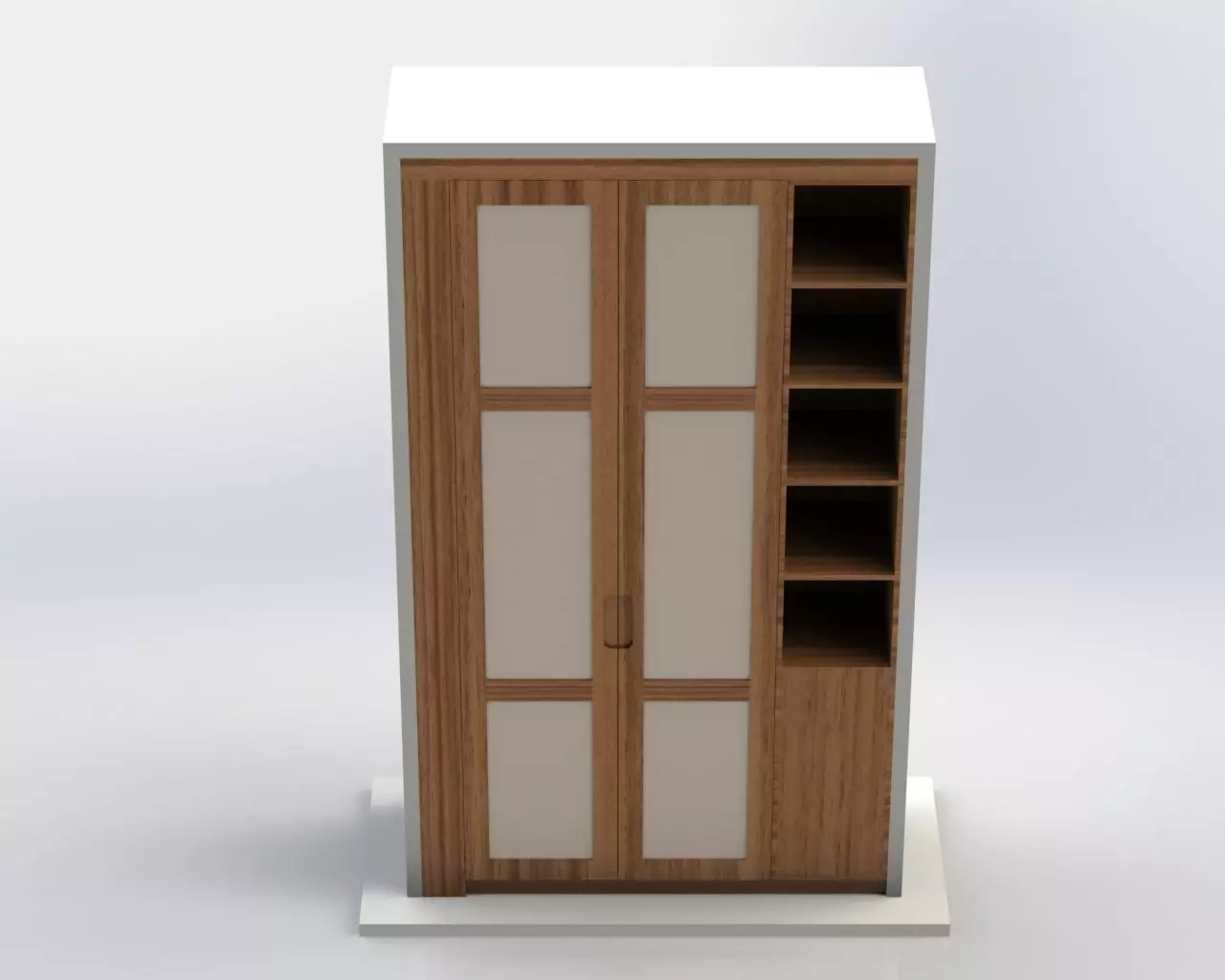 This sophisticated bookshelf features a beautifully crafted design with decorative doors and a small cabinet for storing books, notebooks, and other essentials. The unit is meticulously designed using SolidWorks to ensure precise construction and optimal manufacturability, making it ideal for both residential and office environments.