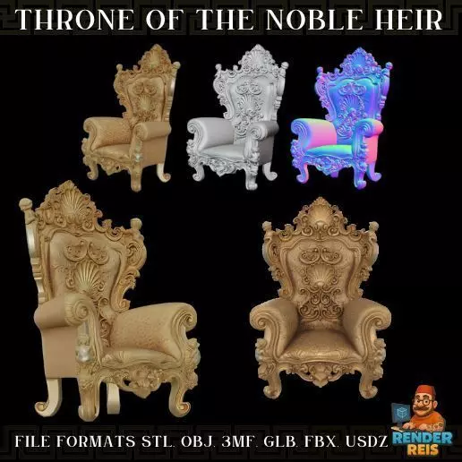 For custom designs, feel free to contact me.This model presents the Throne of the Noble Heir, a chair of elegance and grandeur worthy of a royal palace, inspired by the height of Baroque artistry. Every curve, carving, and angel figure makes this a true work of art in the 3D printing world. Perfect for miniature dioramas, tabletop decorations, or artistic projects.