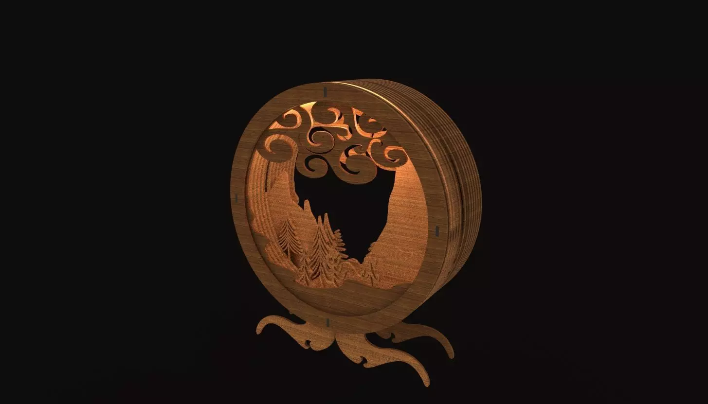 This unique wooden lamp is a blend of artistry and functionality, perfect for home decor enthusiasts. The lamp is circular and features a meticulous design that creates a layered, three-dimensional scene. Inside the circle, carved trees and mountains evoke a serene, natural landscape, while swirling patterns at the top mimic clouds or wind, adding a dynamic touch. Crafted with exceptional attention to detail, the lamp stands on a curved wooden base that harmonizes with the overall design.Its warm and rustic appearance makes it a conversation piece, ideal for living rooms, bedrooms, or any space that benefits from a cozy and artistic ambiance. Whether you're looking to enhance your home or searching for a unique gift, this lamp is sure to impress!