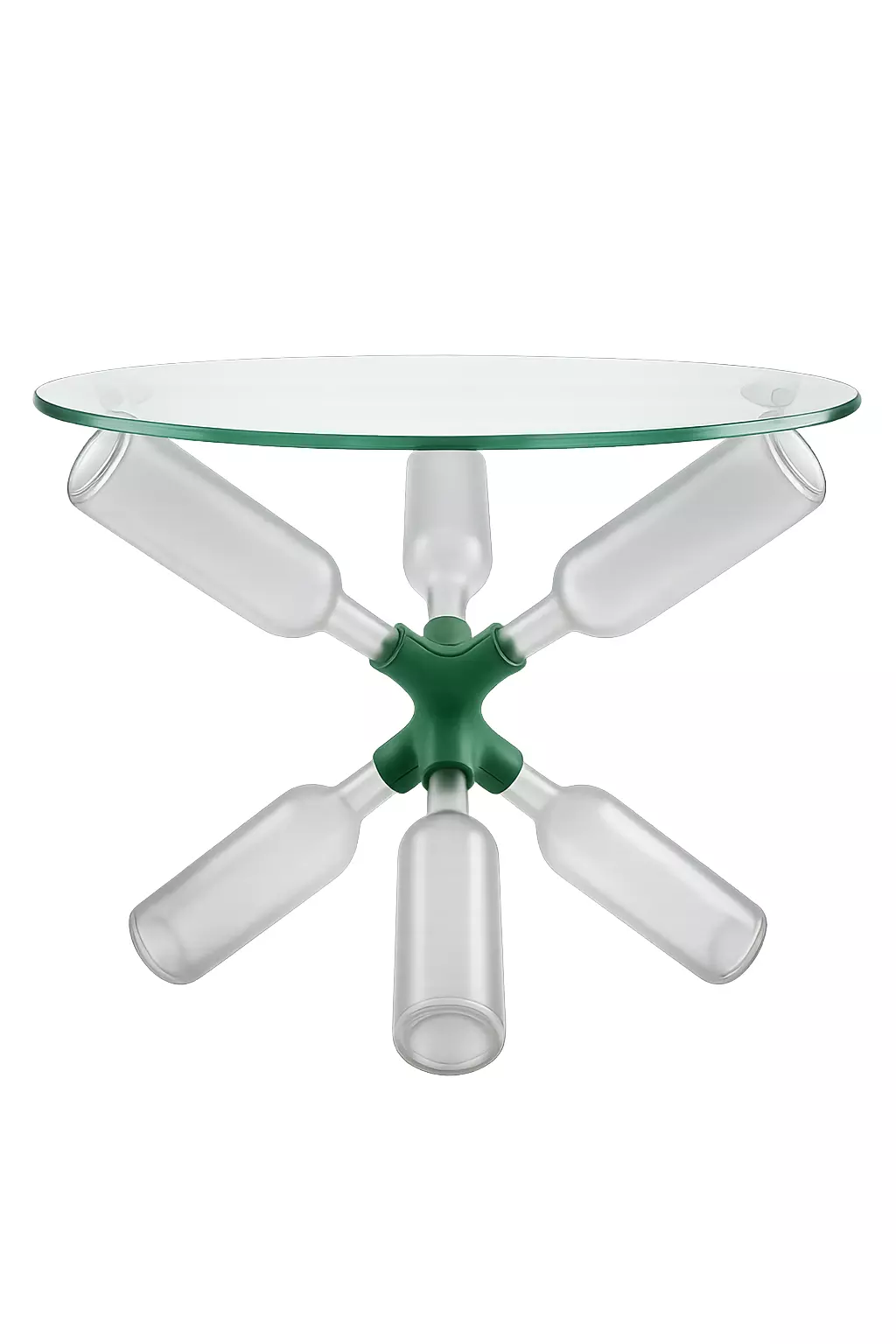 The YAQ Table represents a revolution in functional upcycling. At the core of this designer side table is a biomorphically shaped connector, manufactured using precise 3D printing (TPU HF / ABS Pro). This high-tech component acts as a hub for standard glass bottles, giving them a second life as table legs and supports.