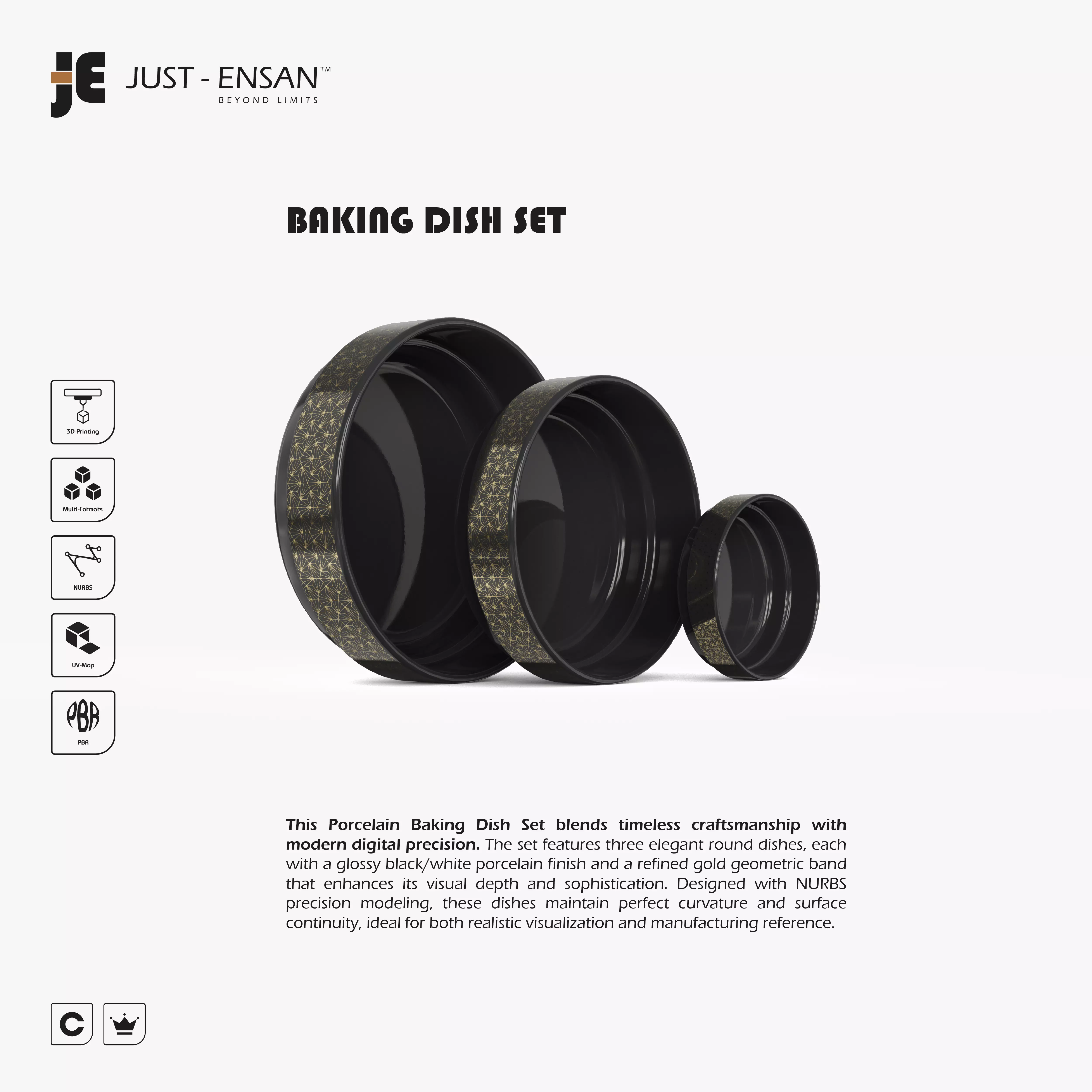 This Porcelain Baking Dish Set blends timeless craftsmanship with modern digital precision. The set features three elegant round dishes, each with a glossy black porcelain finish and a refined gold geometric band that enhances its visual depth and sophistication. Designed with NURBS precision modeling, these dishes maintain perfect curvature and surface continuity, ideal for both realistic visualization and manufacturing reference.