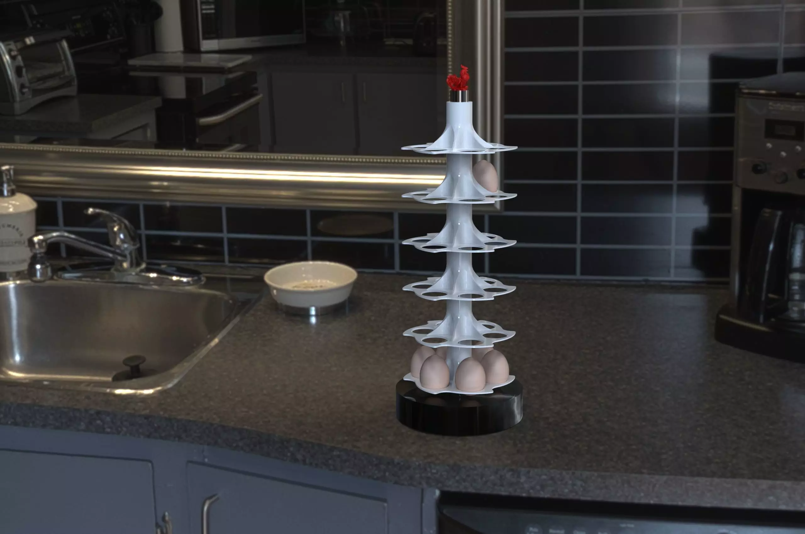 If you have a few gallinaceous (hens, or chickens for friends), you may find yourself quickly having to manage a stock of eggs.That's where your 3D printer comes in handy.Print the supports, put them on a metal bar. (You can also print it but for less than 5$ atdo-it-yourself store the 2m bar in chromed metal, you really have to want to spoil your life...).You find a piece of wood, with a 28 mm hole, put the bar inside and you get a foot. You can also print it, but see the previous chapter, and it's very painful to collect 3 dozen eggs on the kitchen tile ...The metal bar is to be cut at 45cm, and is 25 mm in diameter.With a 4$99 bar, you can even make one for your mother-in-law... a cheap gift for Christmas.