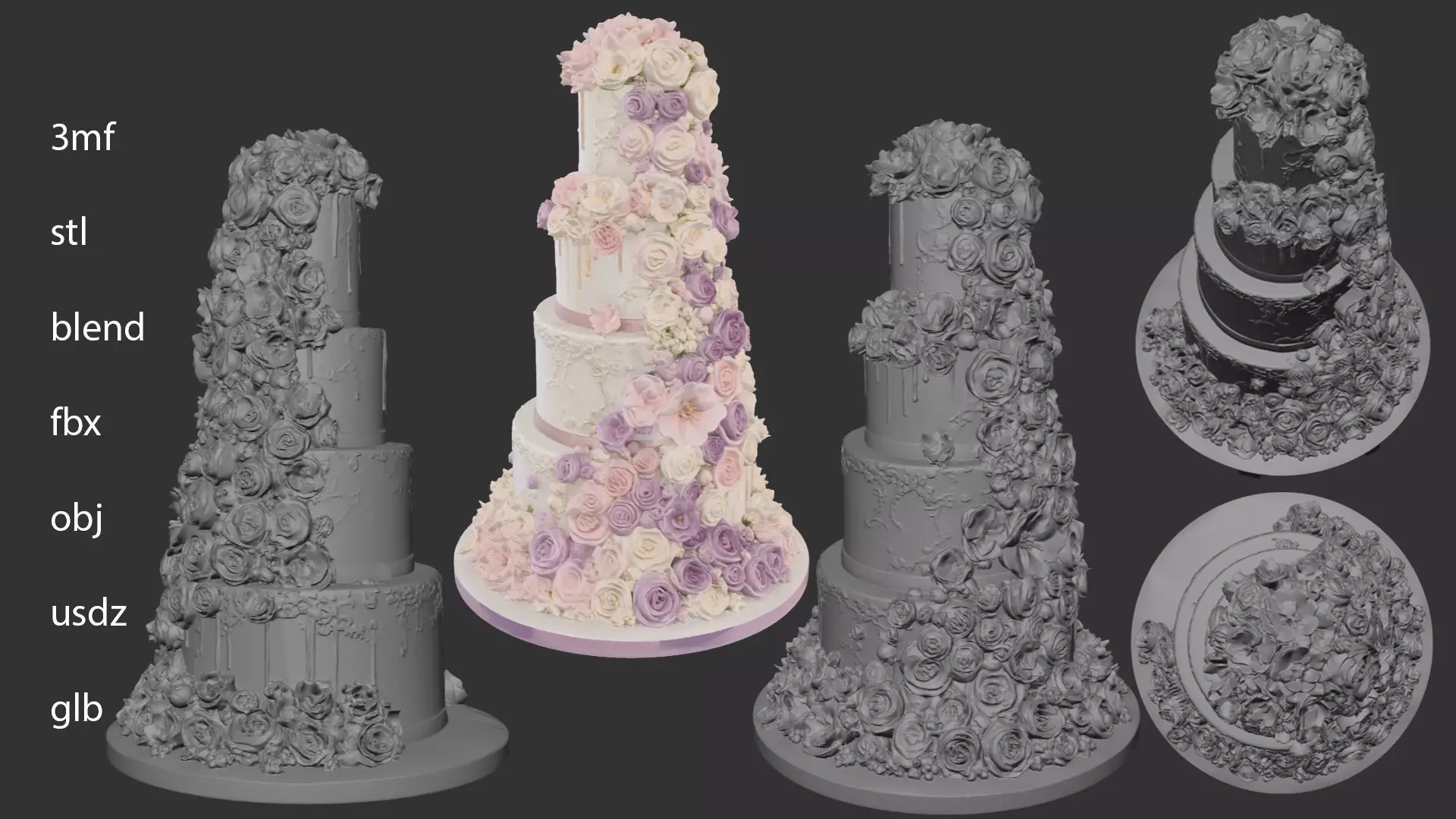 This exquisitely sculpted 3D model features a grand five-tier wedding cake adorned with a magnificent cascade of realistic roses and floral blooms. The design captures the delicate textures of frosting, lace-like filigree, and dripping glaze, making it a masterpiece of digital bakery art. Whether printed as a wedding keepsake, a bakery display piece, or a luxury dollhouse accessory, this model exudes elegance and sophistication.