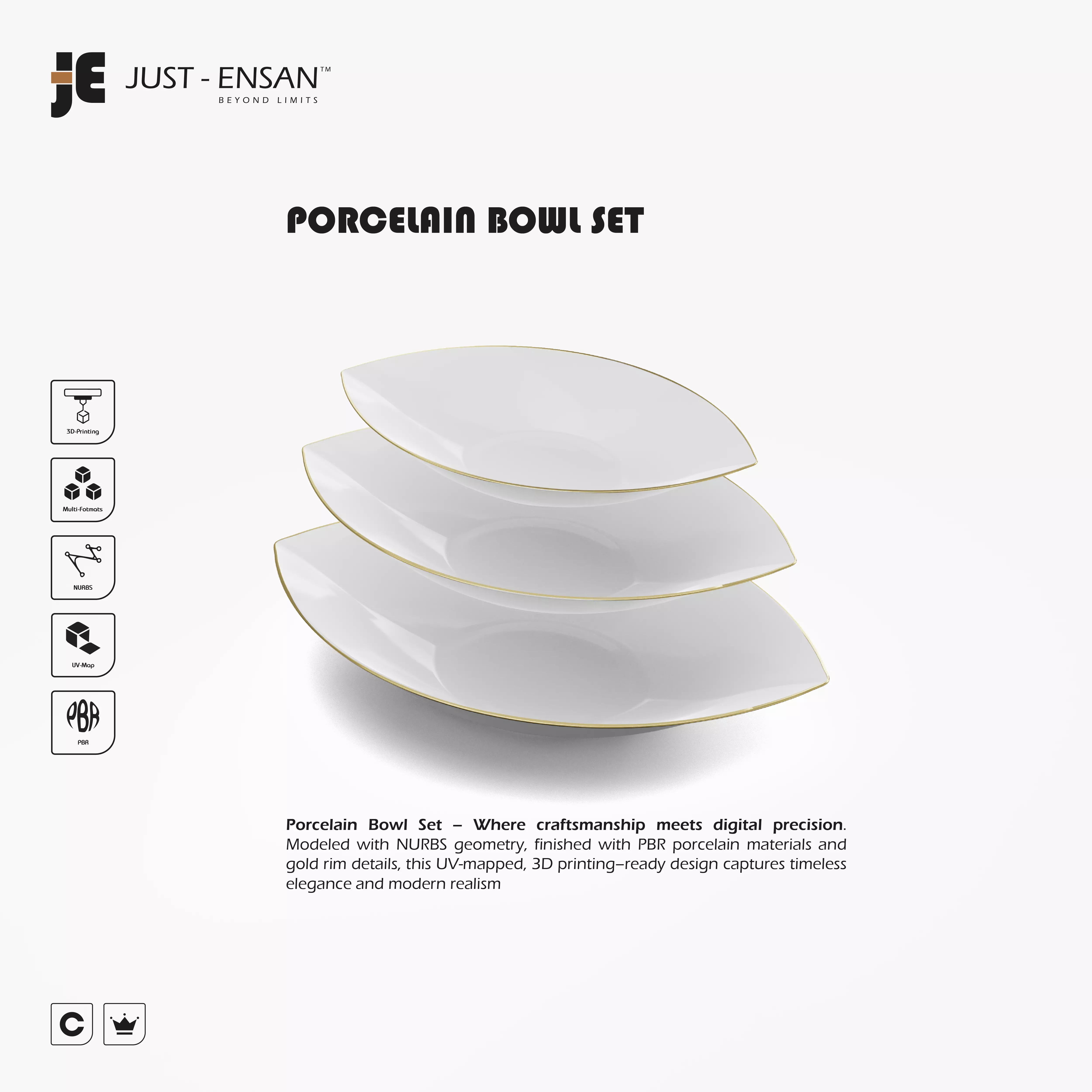 Finished in porcelain PBR materials with a subtle golden rim, this collection evokes refined luxury and timeless design. Every piece is UV mapped, multi-format compatible, and 3D printing ready, making it ideal for rendering, prototyping, or fine tableware visualization.