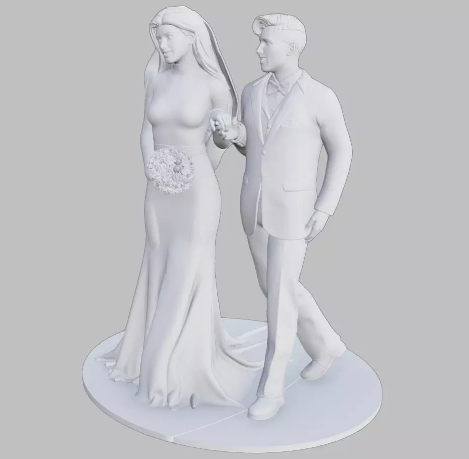 These 3D models are designed as a wedding cake topper, capturing a romantic moment between a bride and groom. The bride wears a long, graceful gown and holds a bouquet of flowers in front of her, while the groom is dressed in a classic suit with a bow tie. They stand closely together on a round base, with the groom gently holding the bride's hand, symbolizing their connection. The design is elegant and detailed, making it a perfect centerpiece for the top of a wedding cake, adding a personalized and memorable touch to the celebration.Upon request, we can modify the bride and groom's bodies and faces to make them look like the real bride and groom at the ceremony.