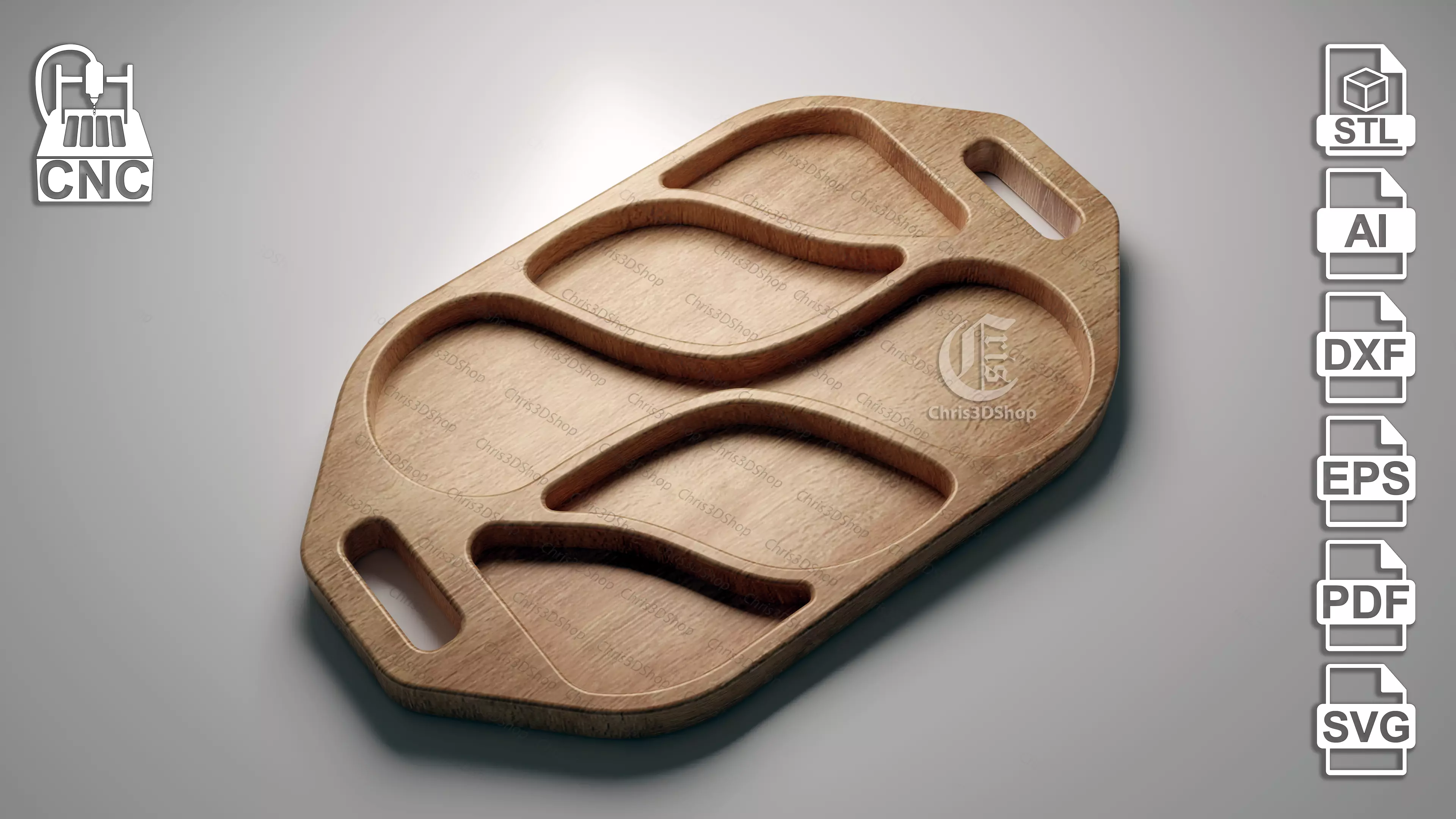 Serving Tray - 3D STL and Vector Files (stl, dxf, svg, eps, ai, pdf) that can be used with Aspire, Vcarve, Carveco ,Artcam or any other cad/cam software that allows you to use one of the formats stated above.It's easier and faster to use the vector files with a CNC Router.I attached the Stl file especially if someone wants to print this on a 3d Printer.