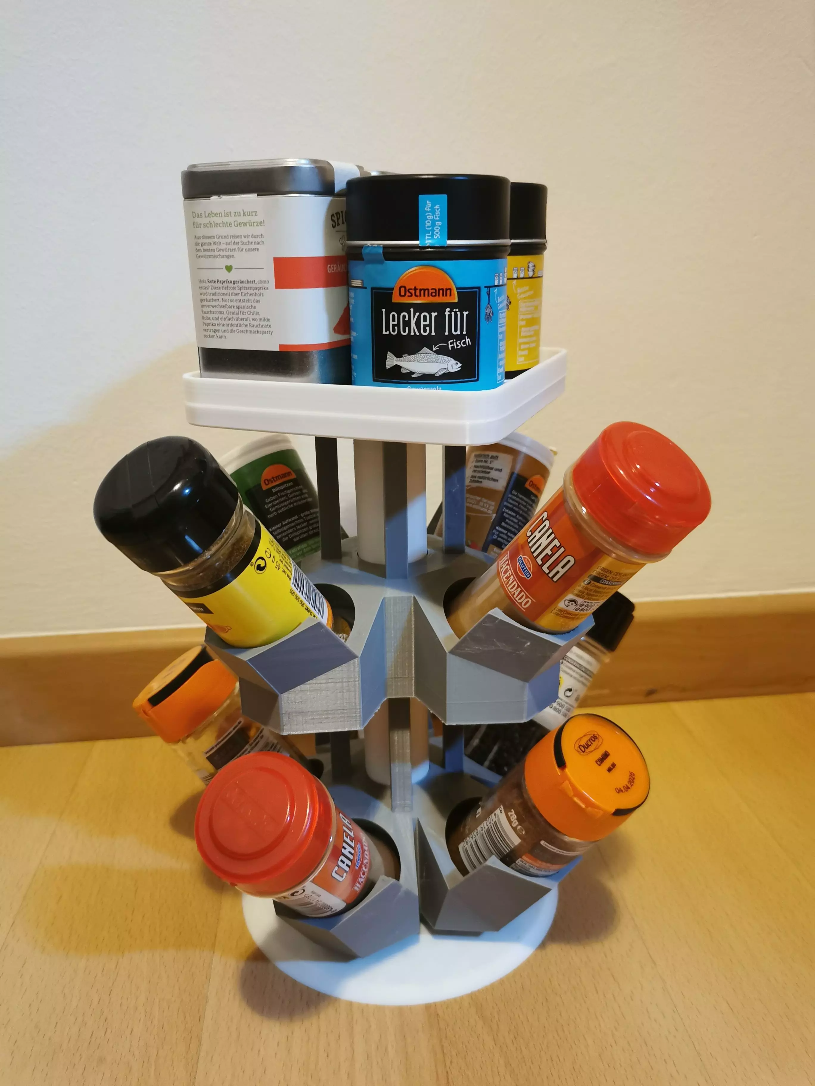 The kitchen cabinets are already completely overflowing, you have to search forever to find the right spice and also more and more spices accumulate. Everyone knows this problem, right? Anyway, I had exactly this problem and the solution was a spice holder as independent as possible, which does not take up extra space in the kitchen cabinet and gives me a good overview of all my spices. In addition, it was important to me to make this model modular, so that when I buy new spices, the spice holder can also be constantly expanded and that the product is made entirely of 3D printed materials and that no other parts are necessary.